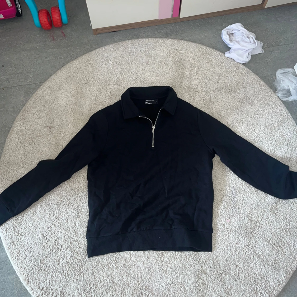Svart långärmad tröja från ASOS med krage och silverfärgad half zip-dragkedja framtill. Tröjan har en klassisk passform och är tillverkad i mjuk bomull, perfekt för lager-på-lager-stil. Enkel och stilren design som funkar till det mesta. Har inte allts använts.