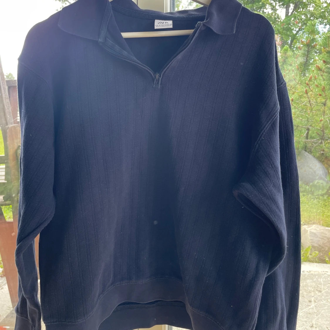 Svart långärmad tröja från Zara i storlek S med krage och half zip framtill. Passar till det mesta och är i väldigt bra skick. Säljes enbart pga för liten för min pojkväns lillebror❣️ (det är damm i luften på bilden, inte fläckar)