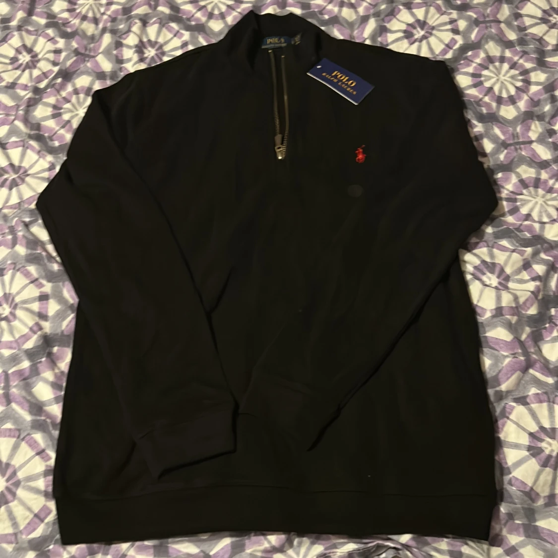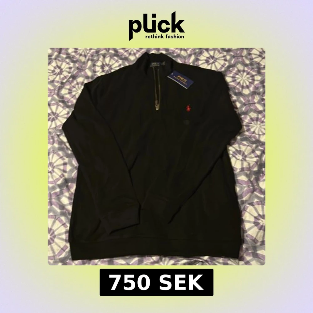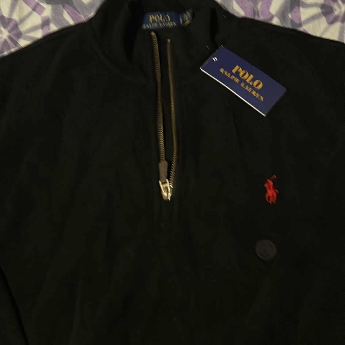 Svart långärmad tröja från Polo Ralph Lauren med half zip-dragkedja och klassisk röd broderad logga på bröstet. Tröjan har hög krage och är tillverkad i mjuk bomull, perfekt för en clean och stilren look.