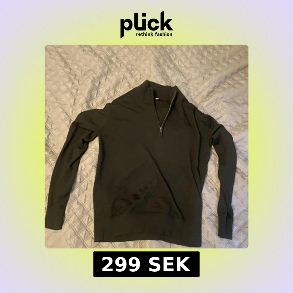 Säljer en svart långärmad tröja från Uniqlo med halv dragkedja vid halsen. Tröjan är tillverkad i 100% ull och har en klassisk, enkel design som passar till många olika stilar.