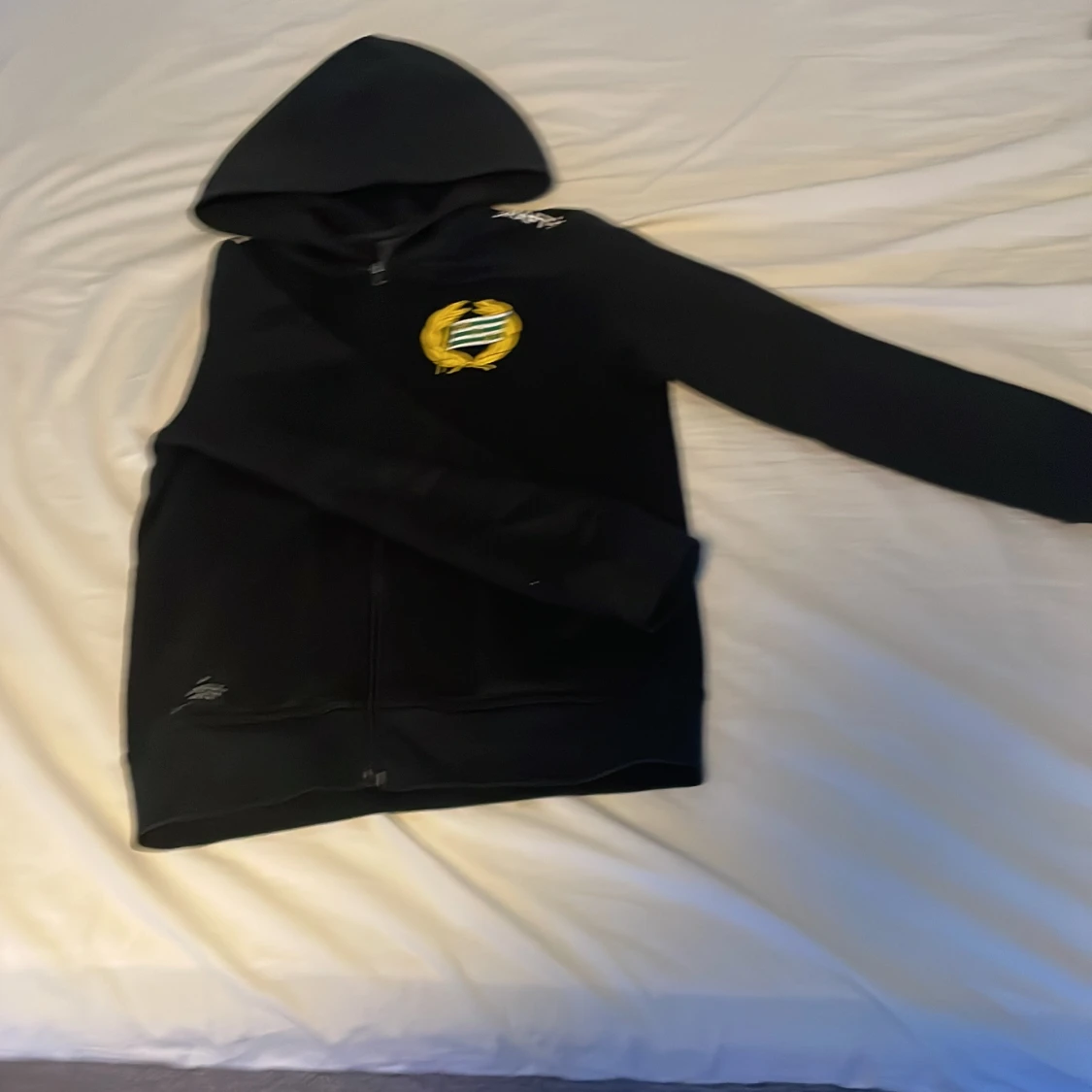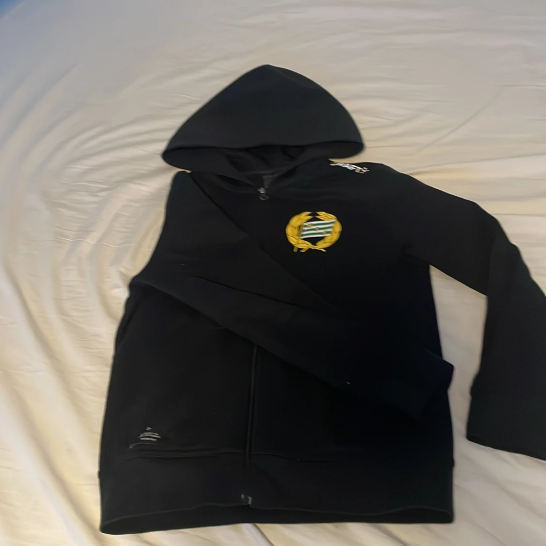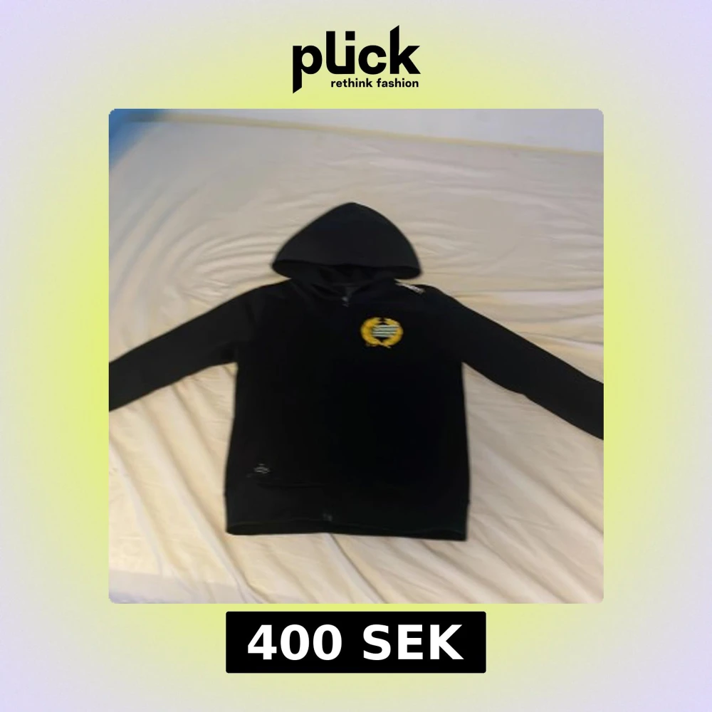 Svart hoodie från Hammarby med klubbens emblem i gult och grönt på bröstet. Tröjan har huva, hel dragkedja framtill och långa ärmar. Perfekt för dig som vill visa ditt stöd för laget och hålla stilen.