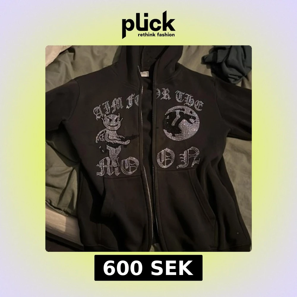 Säljer en svart hoodie från Aim for the Moon. Säljer för den har blivit liten för mig men väldigt bra skick alla stenar sitter kvar.