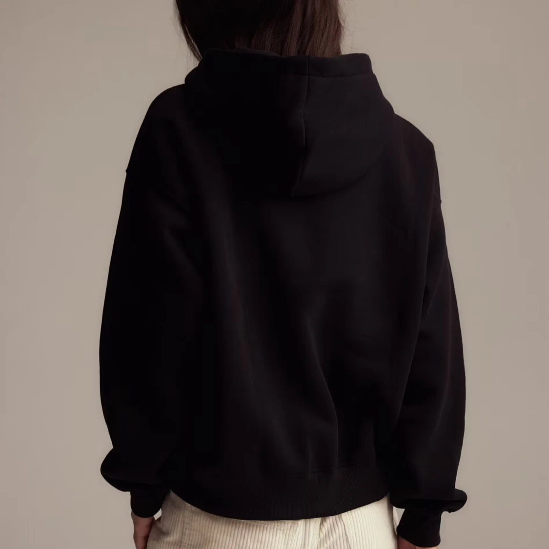 En svart hoodie med huva och långärmad design. Tröjan har en avslappnad passform och är perfekt för kyligare dagar. Tillverkad i mjukt material som känns skönt mot huden. Enkel och stilren look som passar till det mesta.