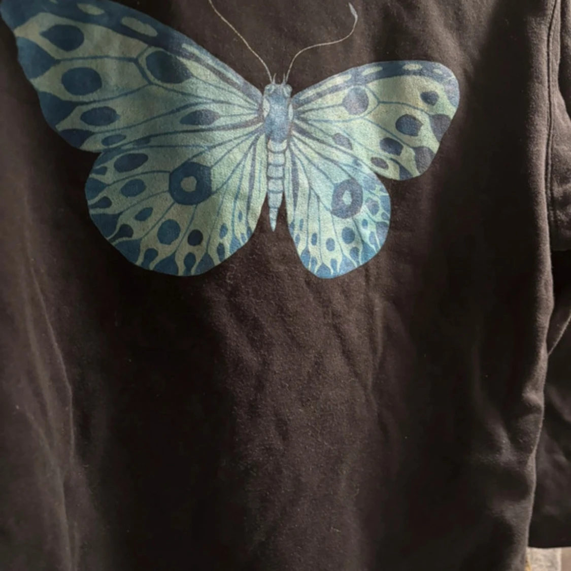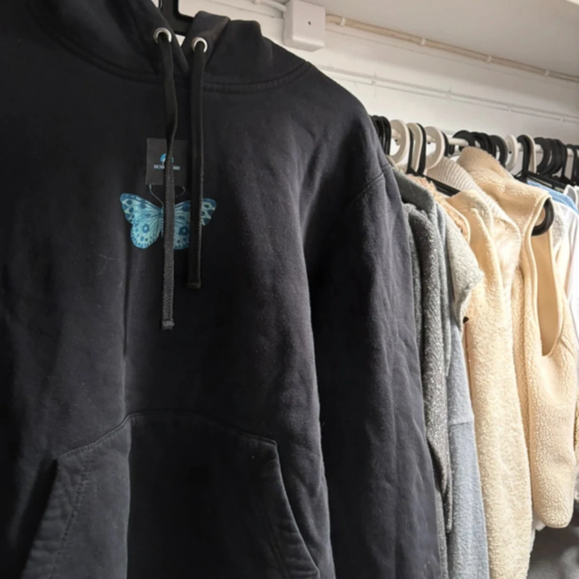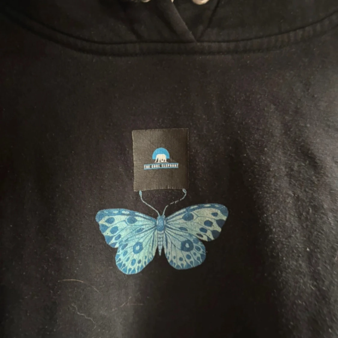 Svart hoodie från The Cove Company med stor blå fjäril på bröstet. Klassisk känguruficka, snörning i huvan och mjukt material. Perfekt för dig som gillar unika tryck och chill stil.