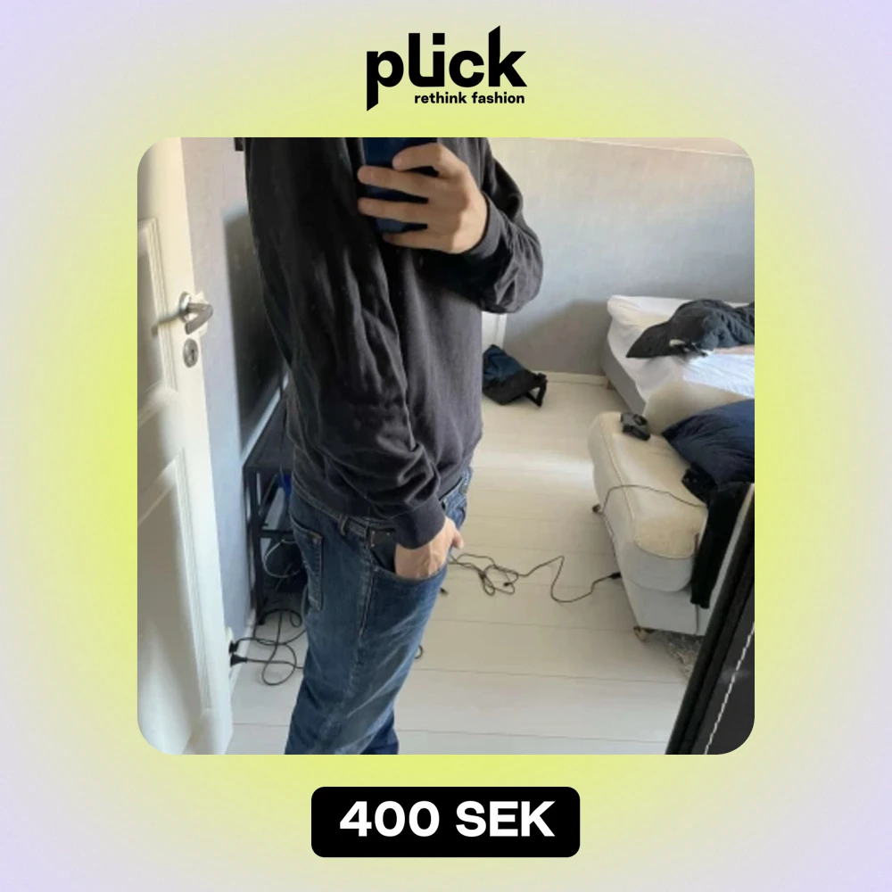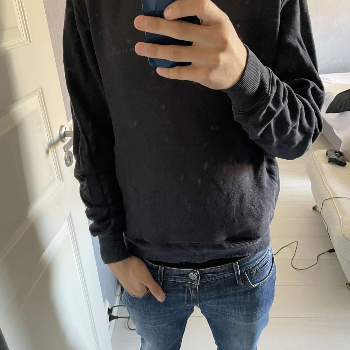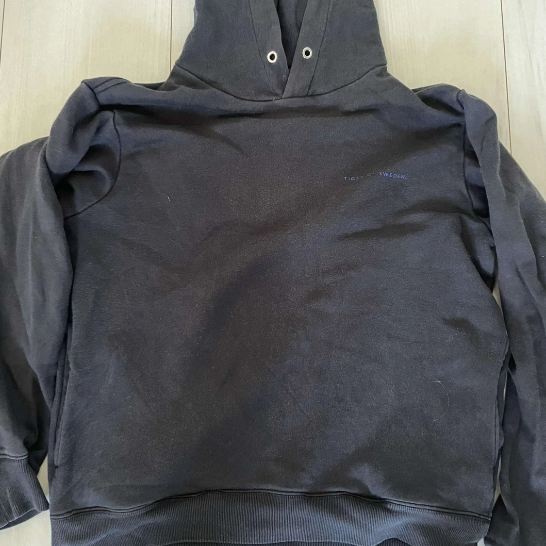 Säljer en mörkblå hoodie i normal passform. Den är långärmad och har en klassisk design med ribbade muddar vid ärmslut och nederkant. Perfekt för en avslappnad stil!