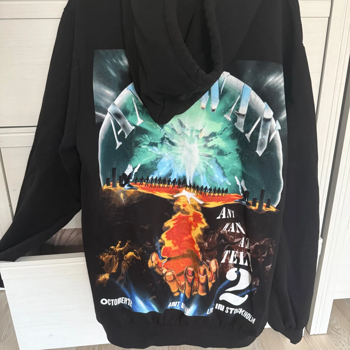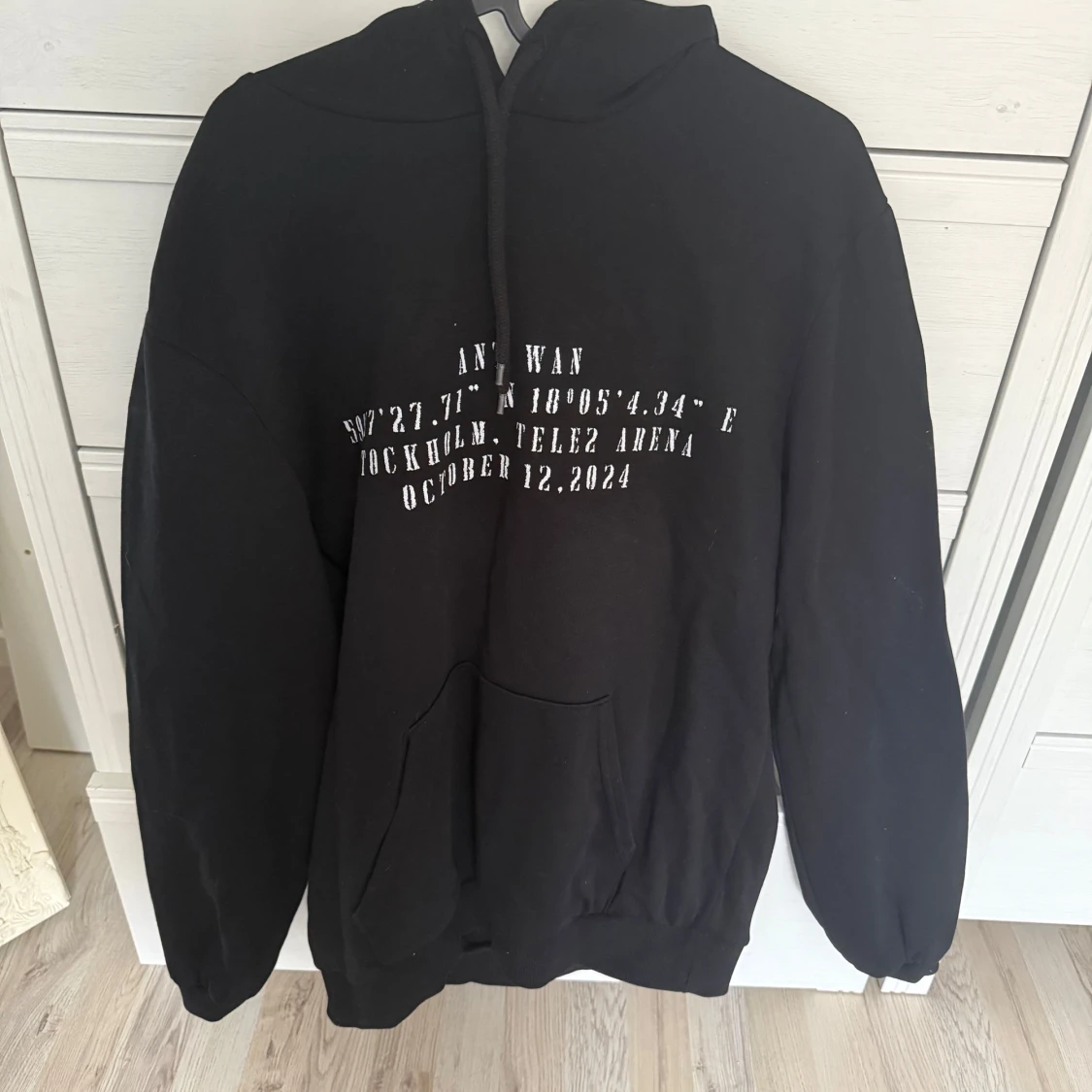 Svart hoodie från Ant Wan med vit text och coolt färgglatt tryck på ryggen från Tele2 Arena-konserten i Stockholm. Tröjan har huva, känguruficka och långa ärmar. Perfekt för dig som vill sticka ut med en unik konsertmerch!