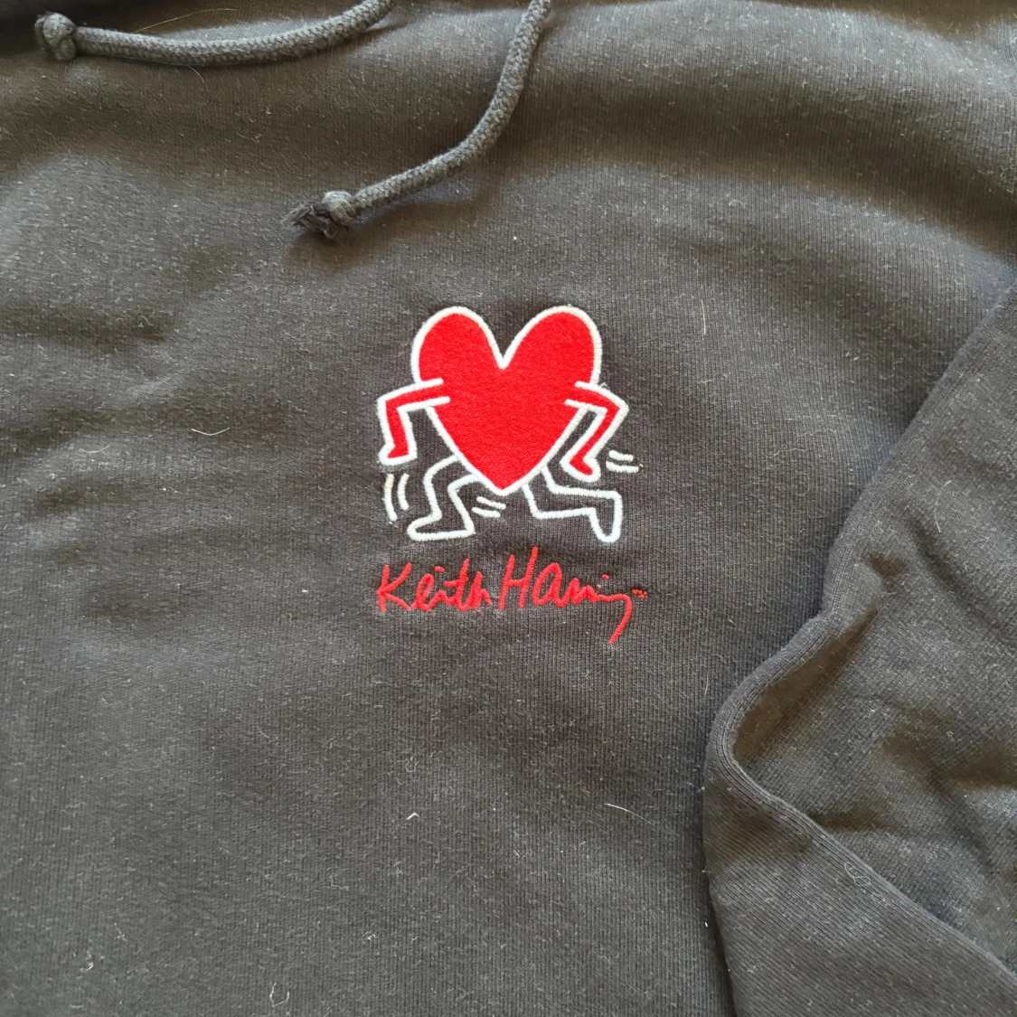 Svart hoodie från Axel Arigato med Keith Haring-broderi på bröstet. Tröjan har en röd hjärtgrafik, dragsko i huvan och känguruficka framtill. Mjuk bomullskvalitet och ribbade muddar. Märkespatch nertill på ryggen.