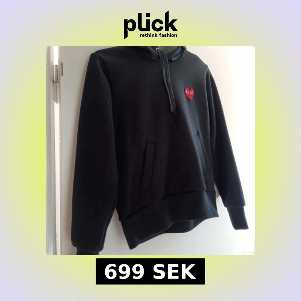 Svart hoodie från Comme des Garçons Play med klassiskt rött hjärta med ögon broderat på bröstet. Tröjan har huva med snörning, magficka och långa ärmar. Mjuk och skön bomullskänsla, perfekt för chill dagar. Passar mer som xs.