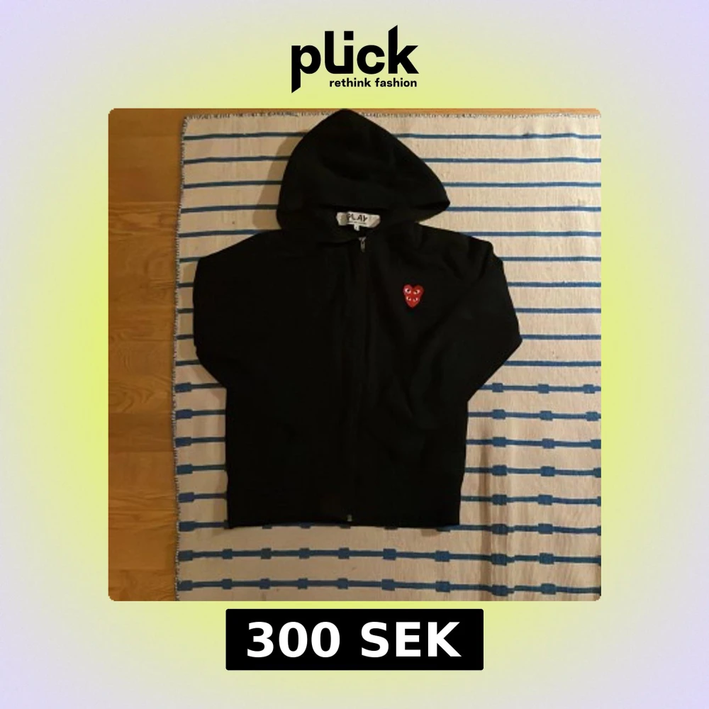 Svart hoodie från Comme des Garçons Play i storlek S. Tröjan har dragkedja, huva och det ikoniska röda hjärta-emblemet med ögon broderat på bröstet. Perfekt för dig som gillar streetwear och vill sticka ut med en stilren look.