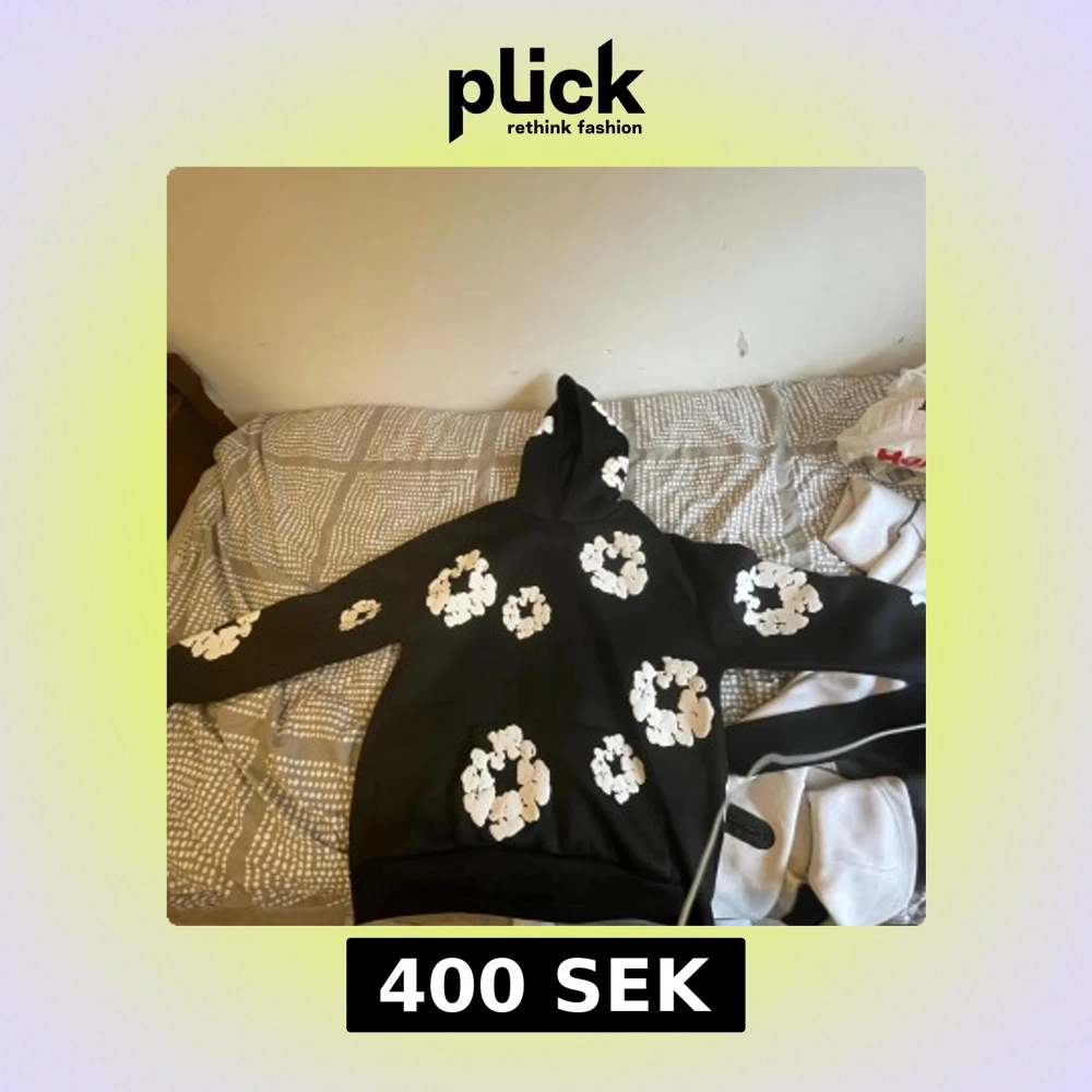 Svart hoodie från Denim Tears med stora vita blommor tryckta över hela tröjan, inklusive huvan och ärmarna. Klassisk känguruficka framtill och skön passform. Perfekt statement-plagg för dig som vill sticka ut.