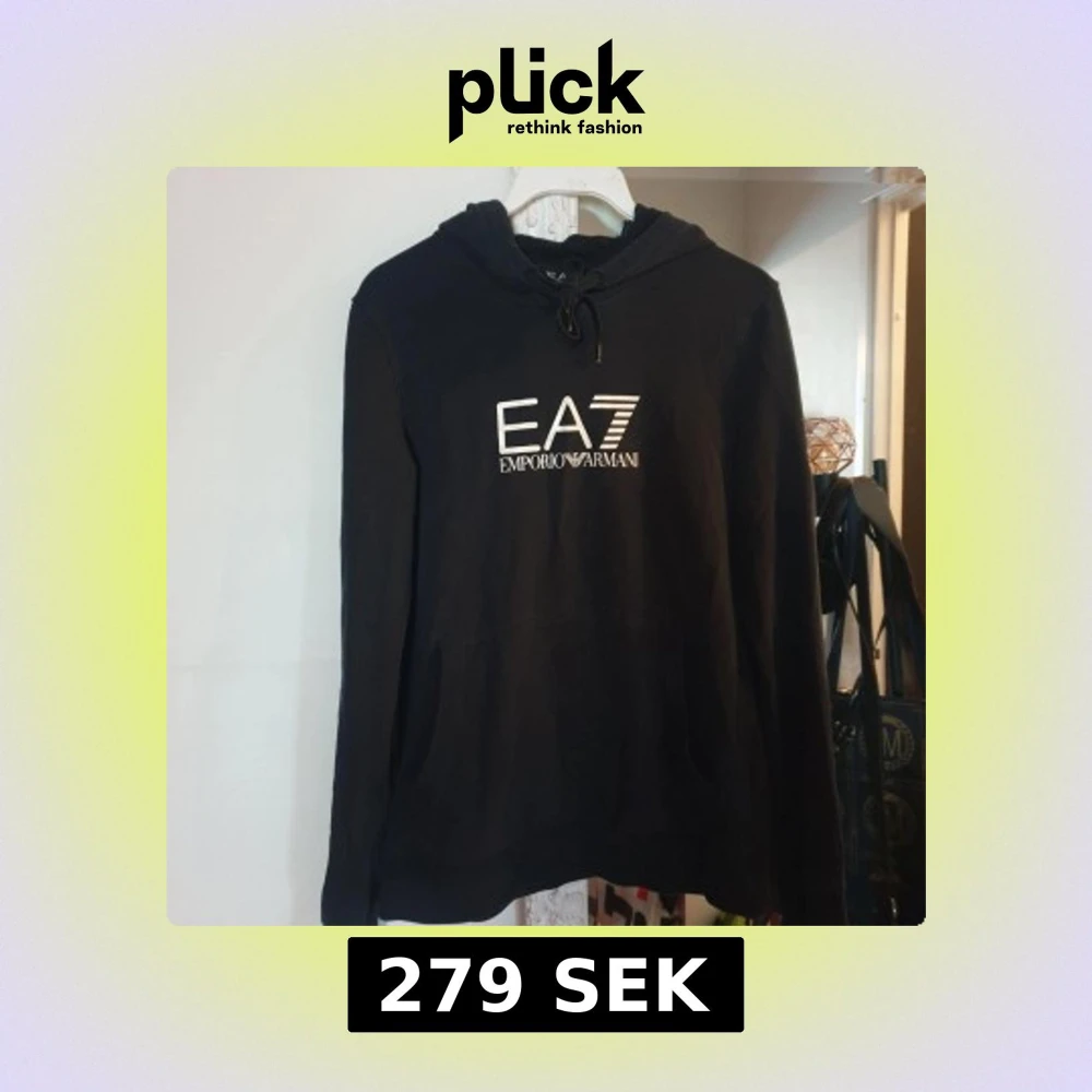 Svart äkta hoodie från EA7 Emporio Armani med vit logga på bröstet och tryck på ryggen. Klassisk huva med snörning och känguruficka framtill. Tillverkad i mjuk bomullsmix, perfekt för en chill och stilren look. Storlek m men upplever den liten, mer som s/xs