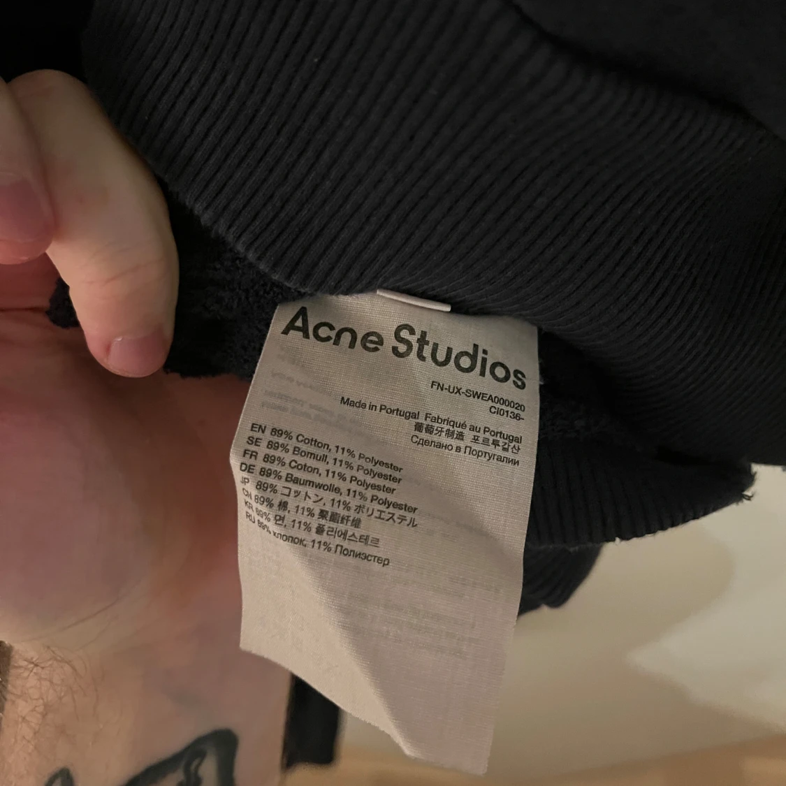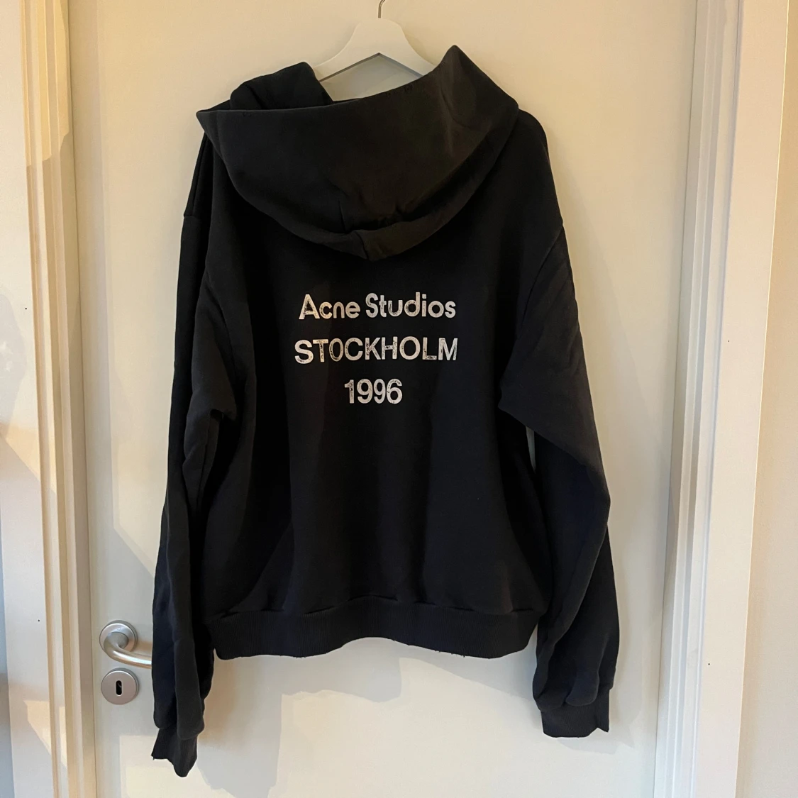 Säljer en svart hoodie från Acne Studios med texten 'Stockholm 1996' på ryggen. Tröjan är tillverkad i en bomullsblandning och har en klassisk passform med långa ärmar och en bekväm huva. Perfekt för en stilren och avslappnad look.