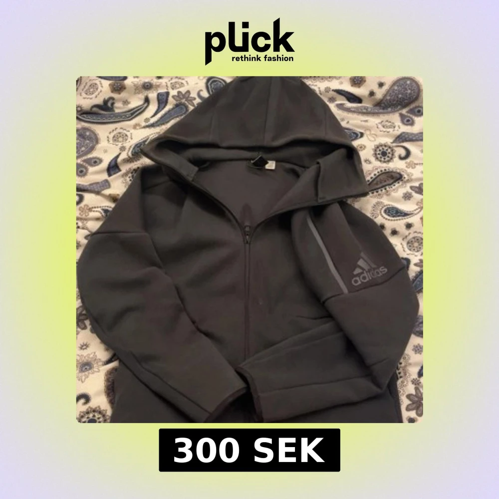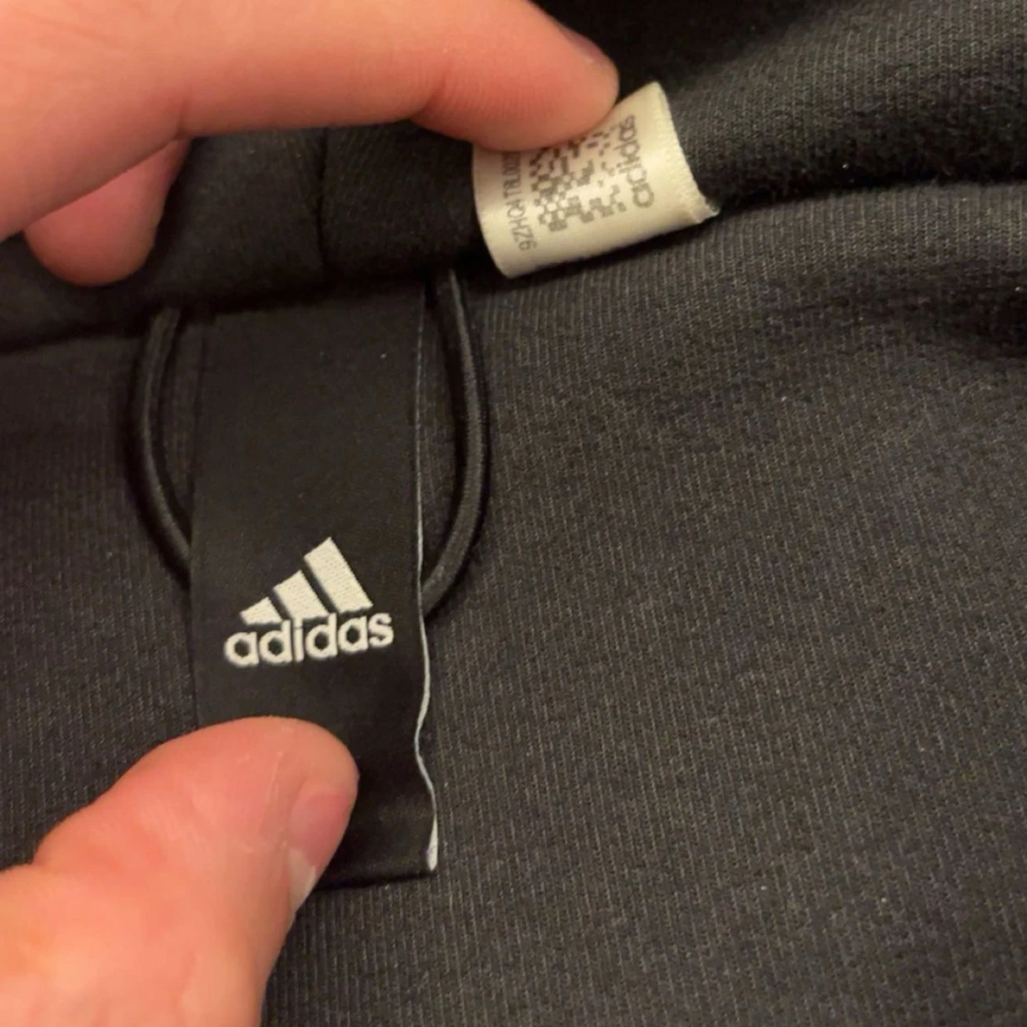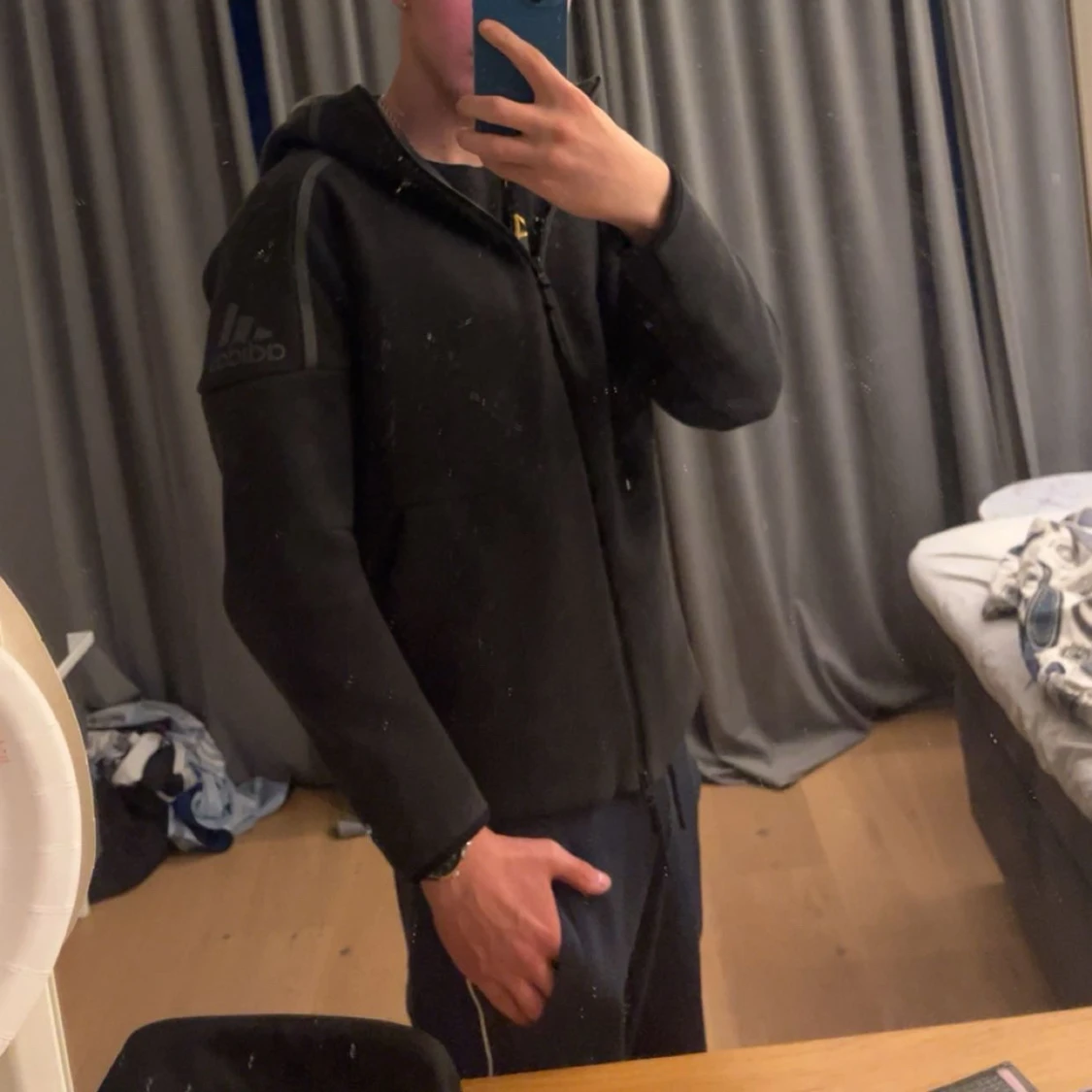 Svart hoodie från Adidas med hel dragkedja och huva. Tröjan har Adidas-logga på ärmen och en diskret grå detalj längs axeln. Skön passform och perfekt för chill eller träning. Materialet är mjukt och känns som polyester eller fleece.