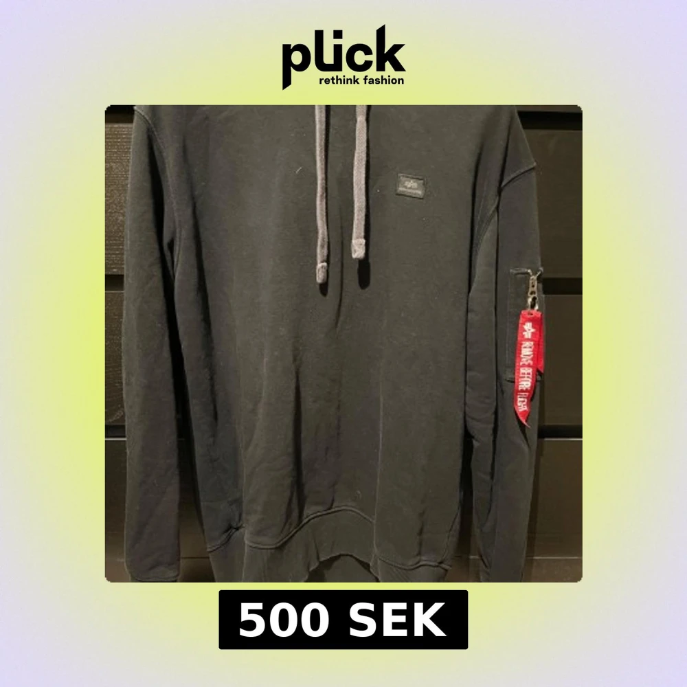 Säljer en svart hoodie från Alpha Industries med en cool 'Remove Before Flight'-detalj på ärmen. Hoodien har en ficka med dragkedja på ärmen och justerbara snören i huvan. Insidan är i en kontrasterande orange färg. Produkten är inköpt i fysisk butik på Väla i Helsingborg på Carlings. Knappt använd.