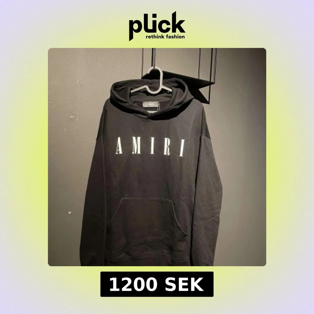 Säljer en svart hoodie från Amiri med vit logotyp på bröstet. Tröjan har huva och en stor magficka framtill. Perfekt för en avslappnad och stilren look.