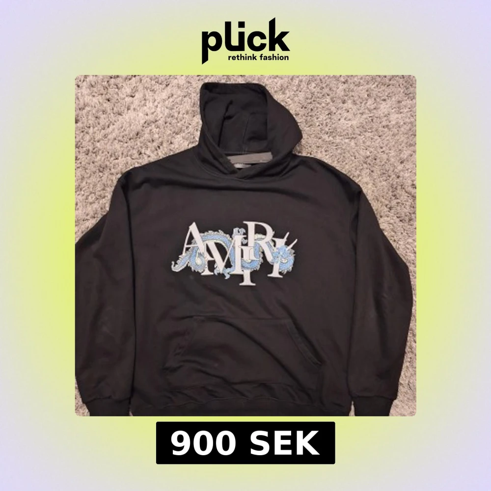 Svart hoodie från Amiri med stor logga och blå drakmotiv på bröstet. Klassisk känguruficka framtill och huva. Tröjan har långa ärmar och en relaxed passform, perfekt för en streetwear-look.