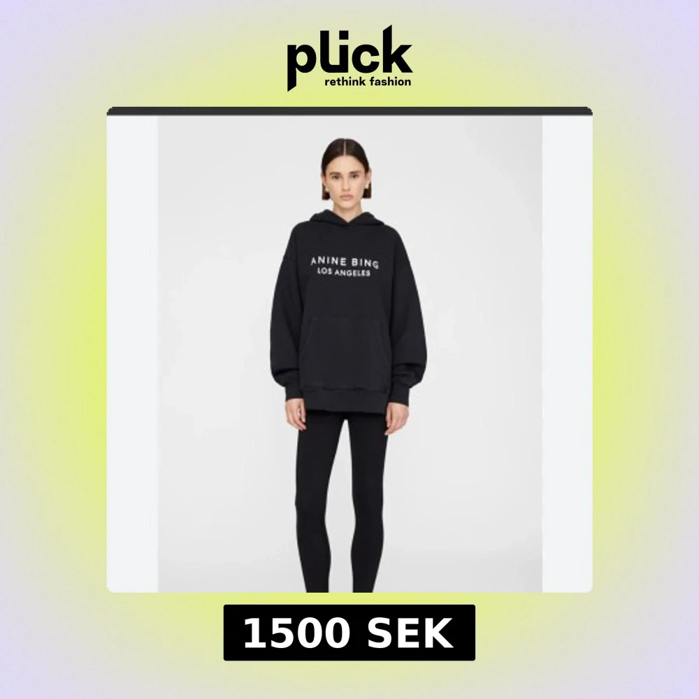 Svart oversized hoodie från Anine Bing med vit text 'ANINE BING LOS ANGELES' på bröstet. Tröjan har huva, stor magficka och långa ärmar med ribbade muddar. Perfekt för en chill och cool look.
