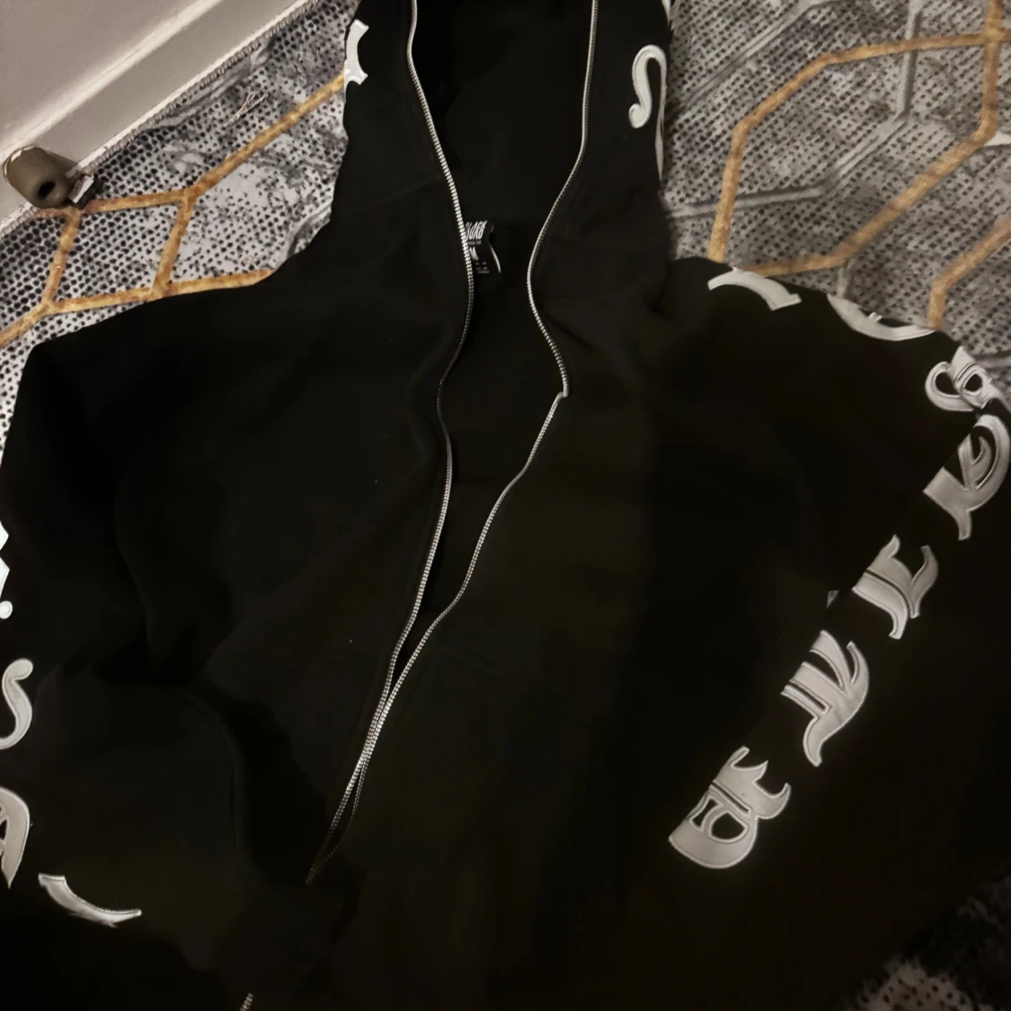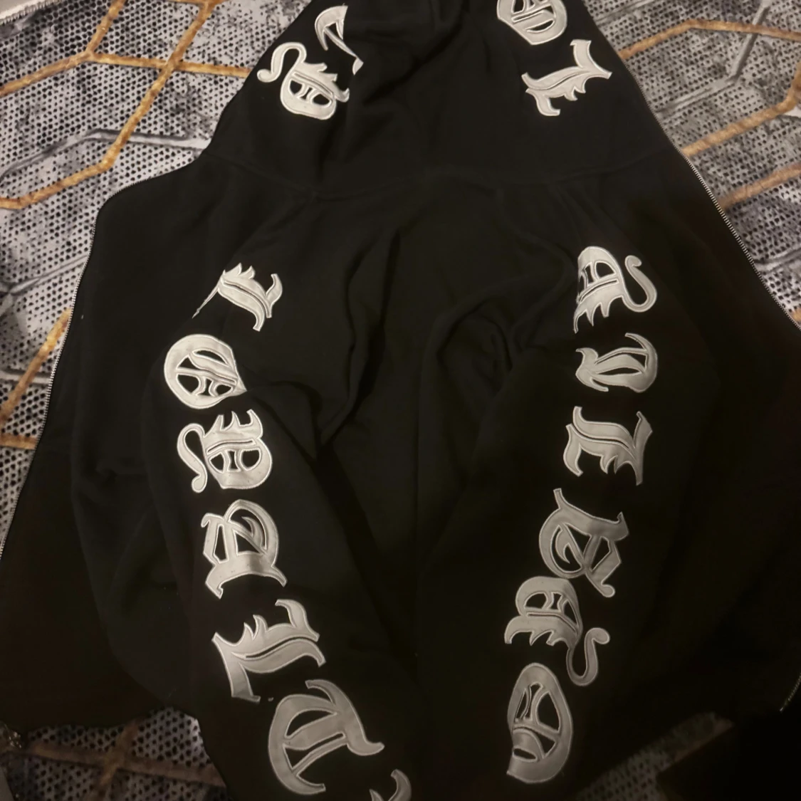 Svart hoodie från Anti Social Social Club med stora vita tryck längs ärmarna och huvan. Tröjan har dragkedja hela vägen, huva och en unik dragkedjetag med logga. Perfekt för dig som gillar streetwear och vill sticka ut.