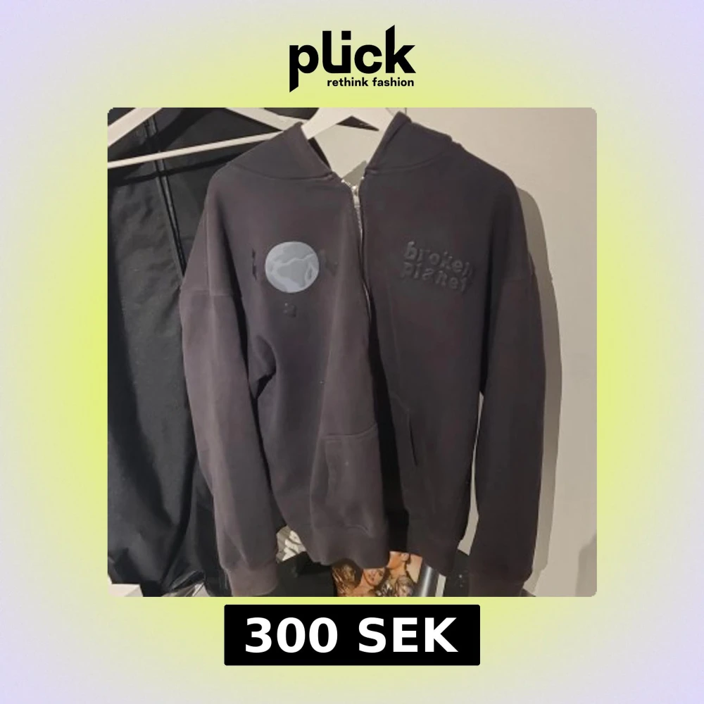 Säljer en svart hoodie från Broken Planet med dragkedja och coolt planetmotiv på bröstet. Baksidan har ett unikt mönster som ger en extra touch. Perfekt för dig som vill ha en stilren men ändå iögonfallande look.