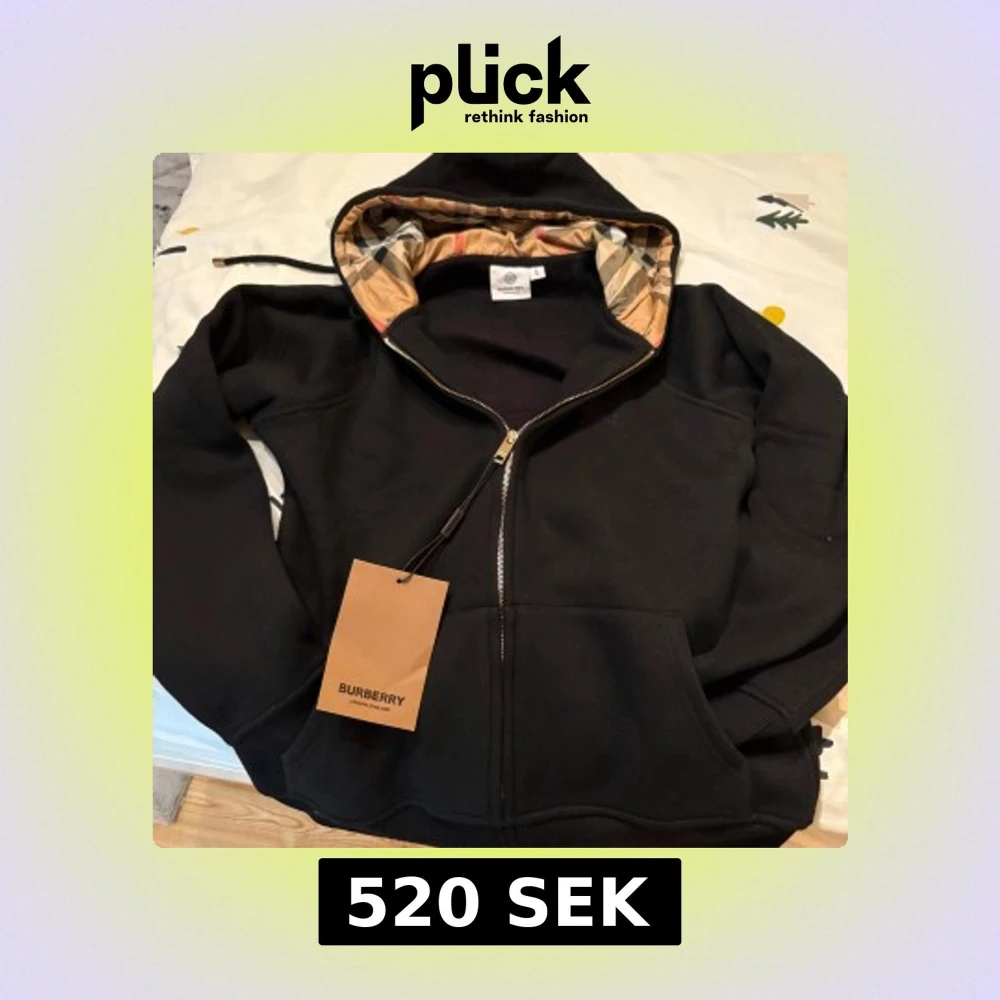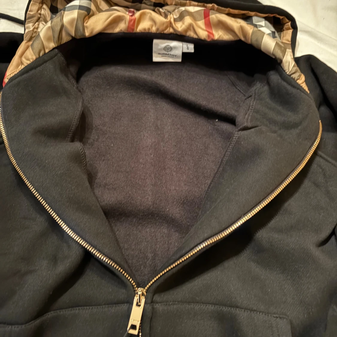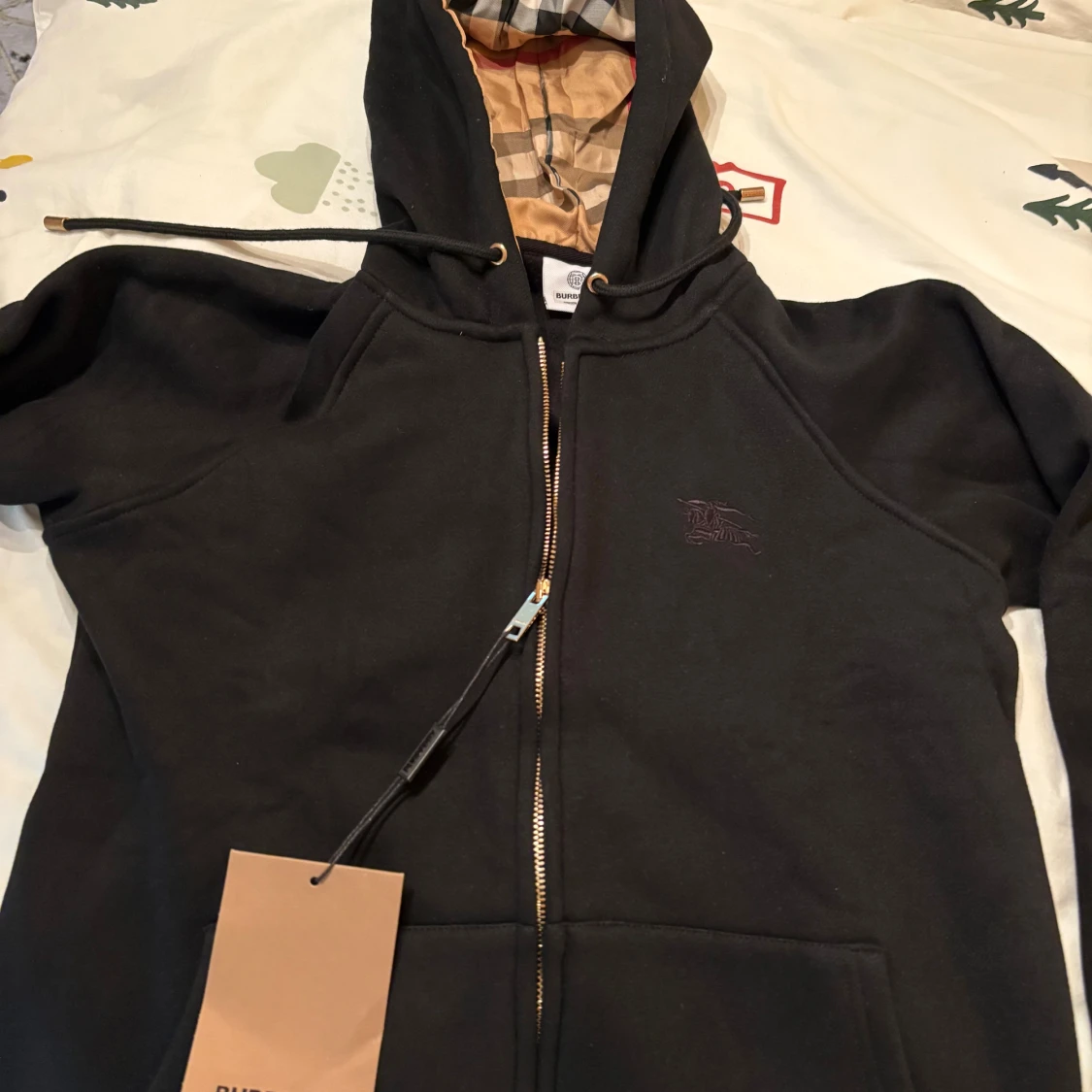Storlek S !!!! Svart hoodie från Burberry med klassiskt rutigt foder i huvan och guldfärgad dragkedja. Tröjan har broderad logga på bröstet, känguruficka och snörning i huvan. Tillverkad i mjuk bomull med lite elastan för extra komfort.