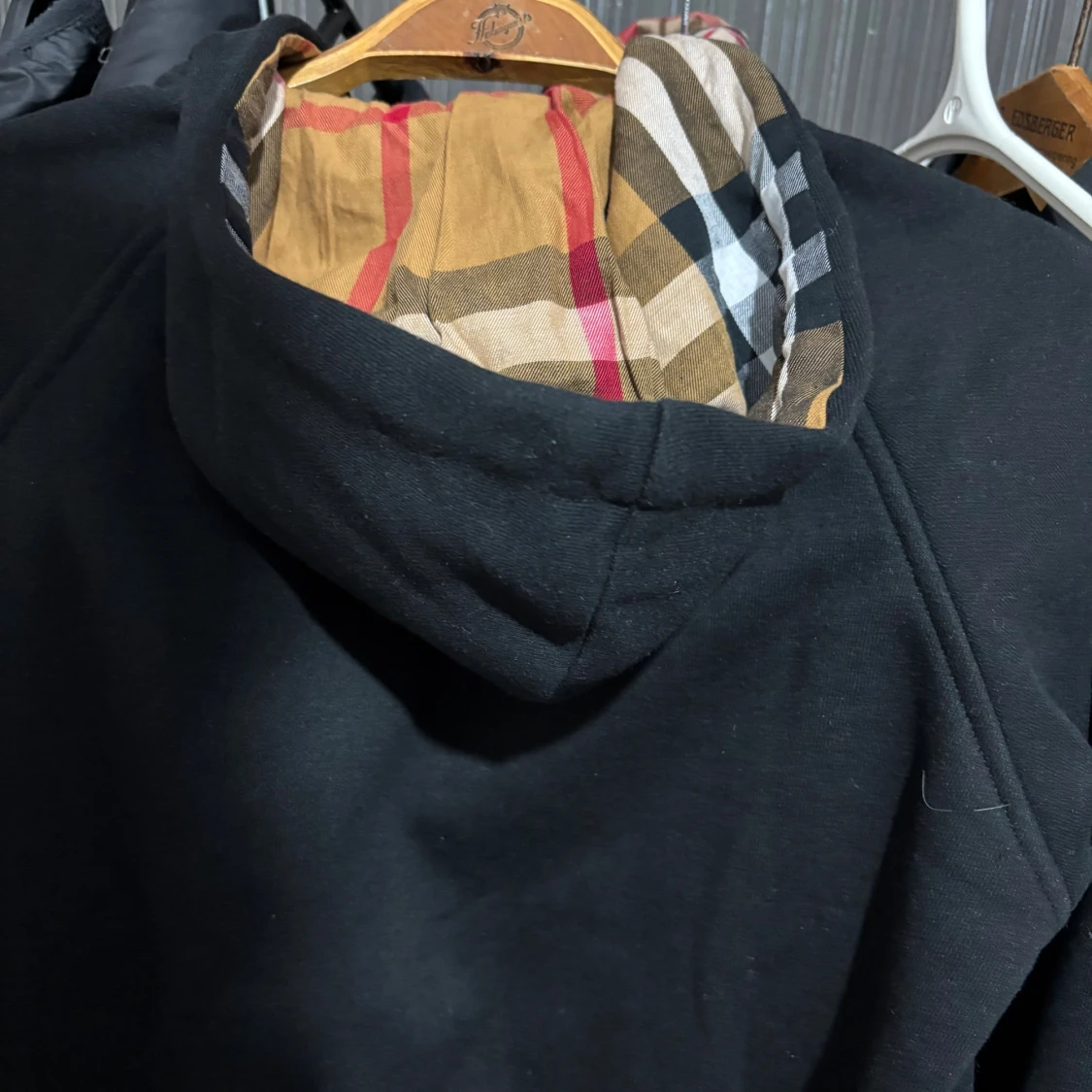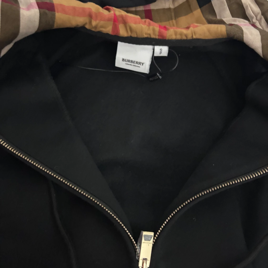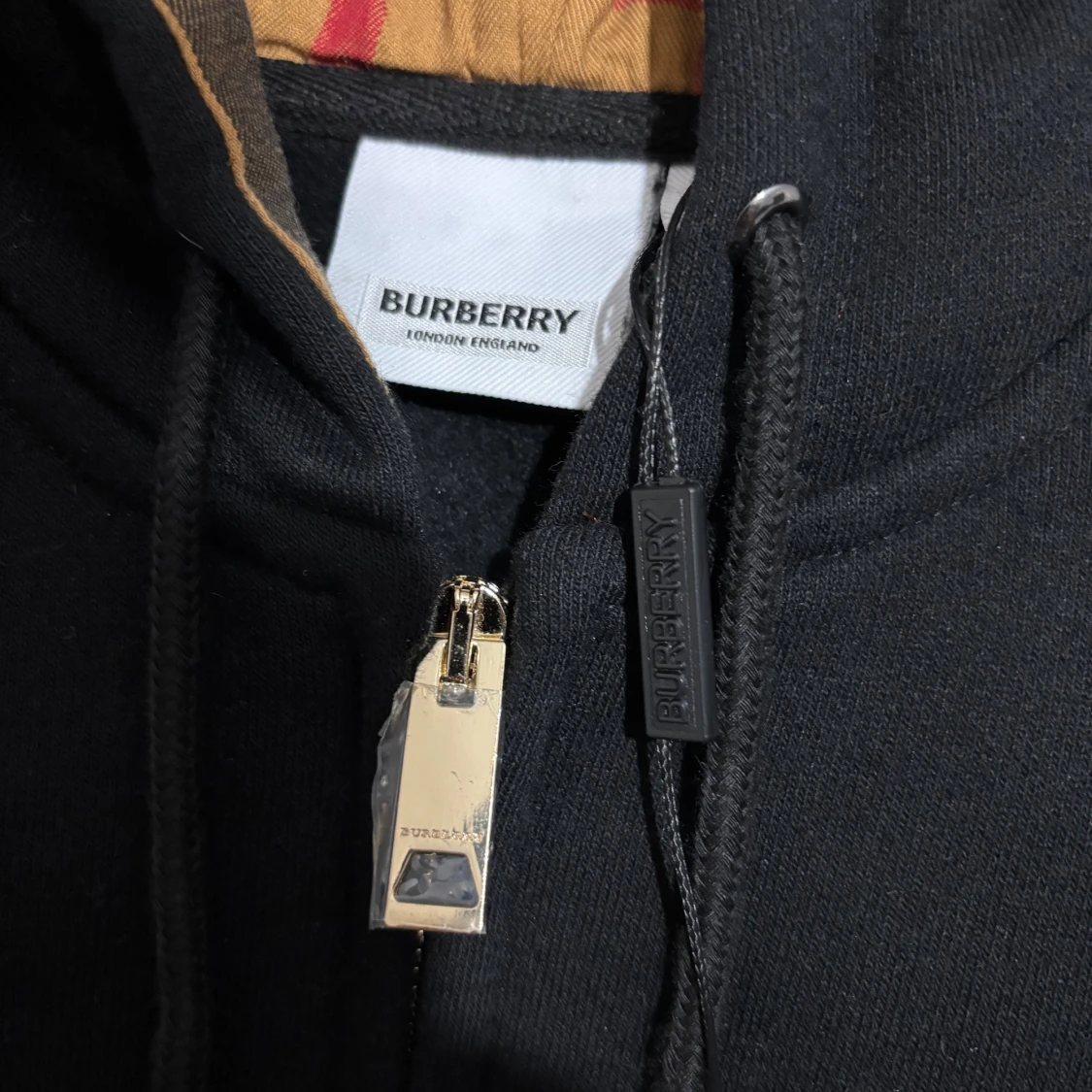 Svart hoodie från Burberry med klassisk rutmönstrad insida i huvan. Tröjan har guldfärgad dragkedja, snörning vid huvan och två stora fickor framtill. Materialet är mjuk bomull och passformen är normal. Perfekt för dig som gillar stilrena märkesplagg.
