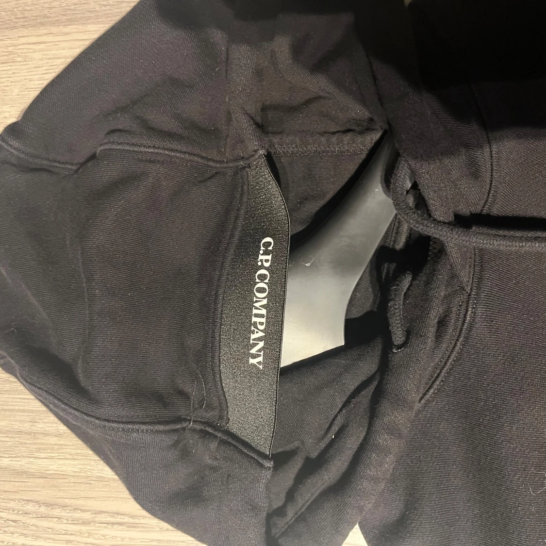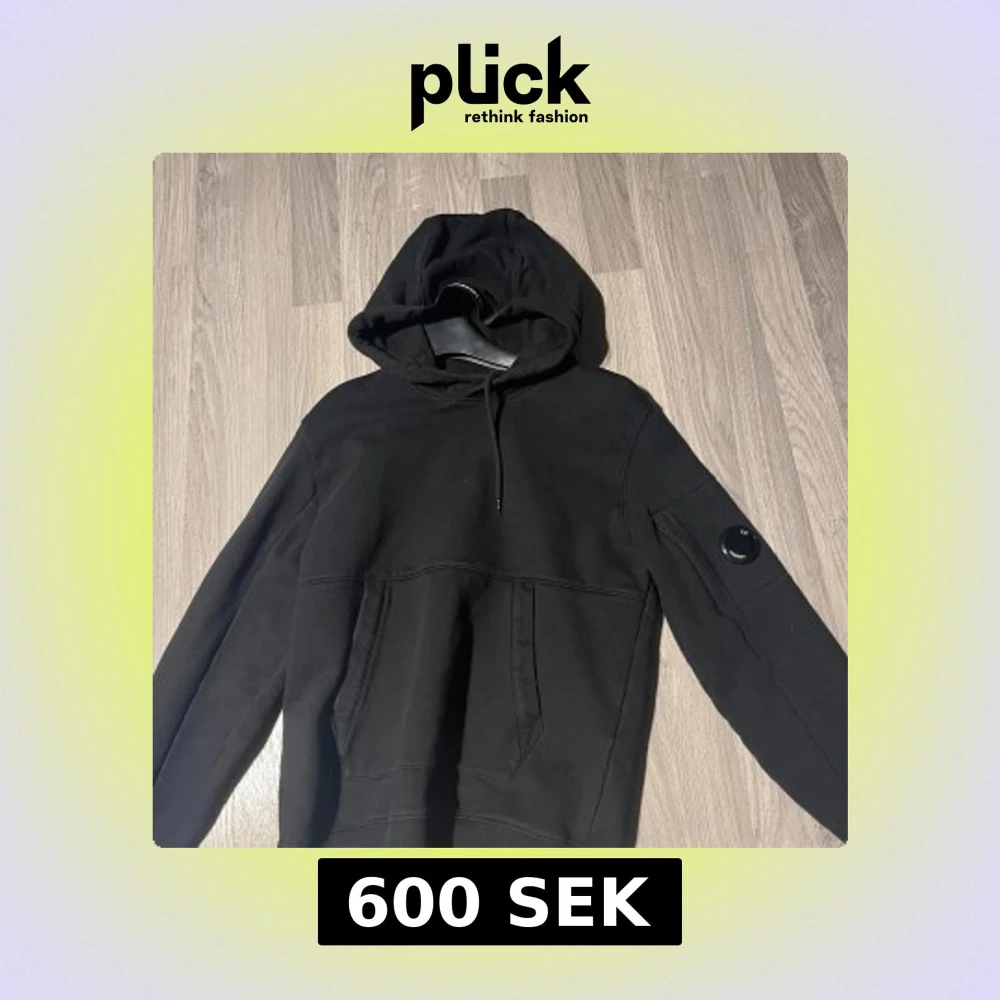 Säljer en stilren svart hoodie från C.P. Company. Den har en klassisk design med huva och en ficka framtill. Storlek S