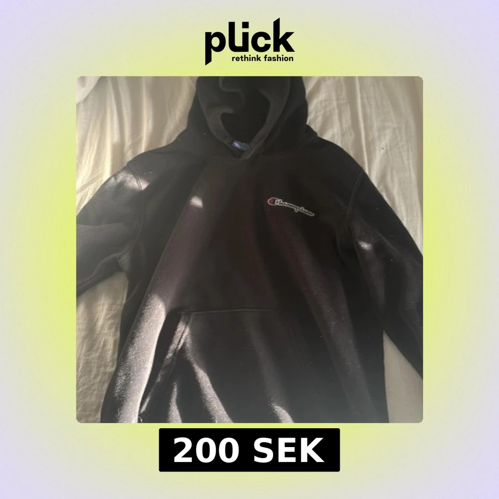 Säljer en klassisk svart hoodie från Champion. Den har en känguruficka framtill och en justerbar huva. Perfekt för en avslappnad stil. Den har inga snören då jag för länge sedan tagit ut dem då de passade bättre, storlek S. Säljer då jag inte har användning för den längre. Har en liten missfärgning vid halsen men syns knappt. Pris går att diskutera vid snabb affär 🩷