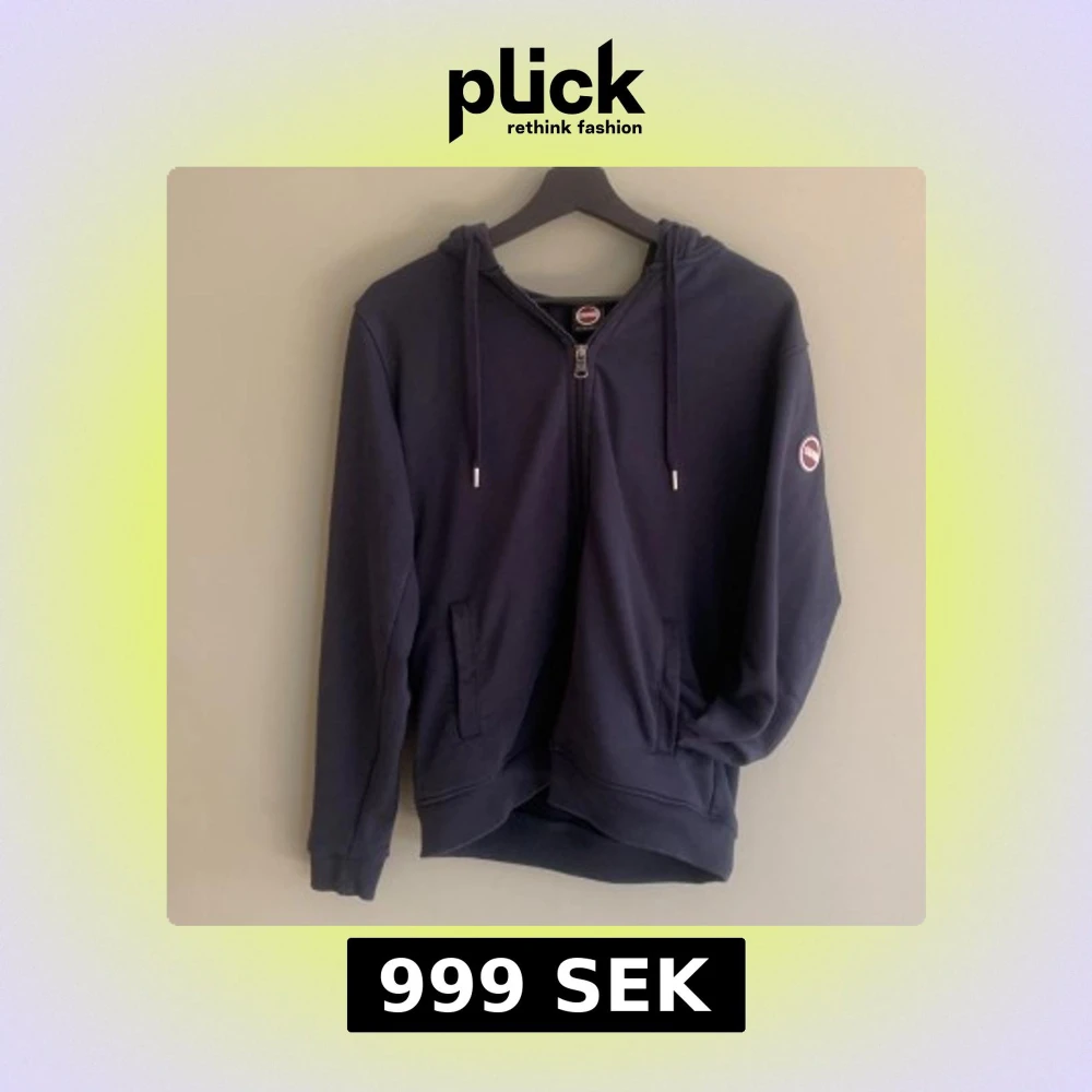 Säljer en stilren navy blue hoodie från Colmar med dragkedja och justerbar huva. Perfekt för en avslappnad look. Den har en liten logga på ärmen och är tillverkad i ett mjukt material.