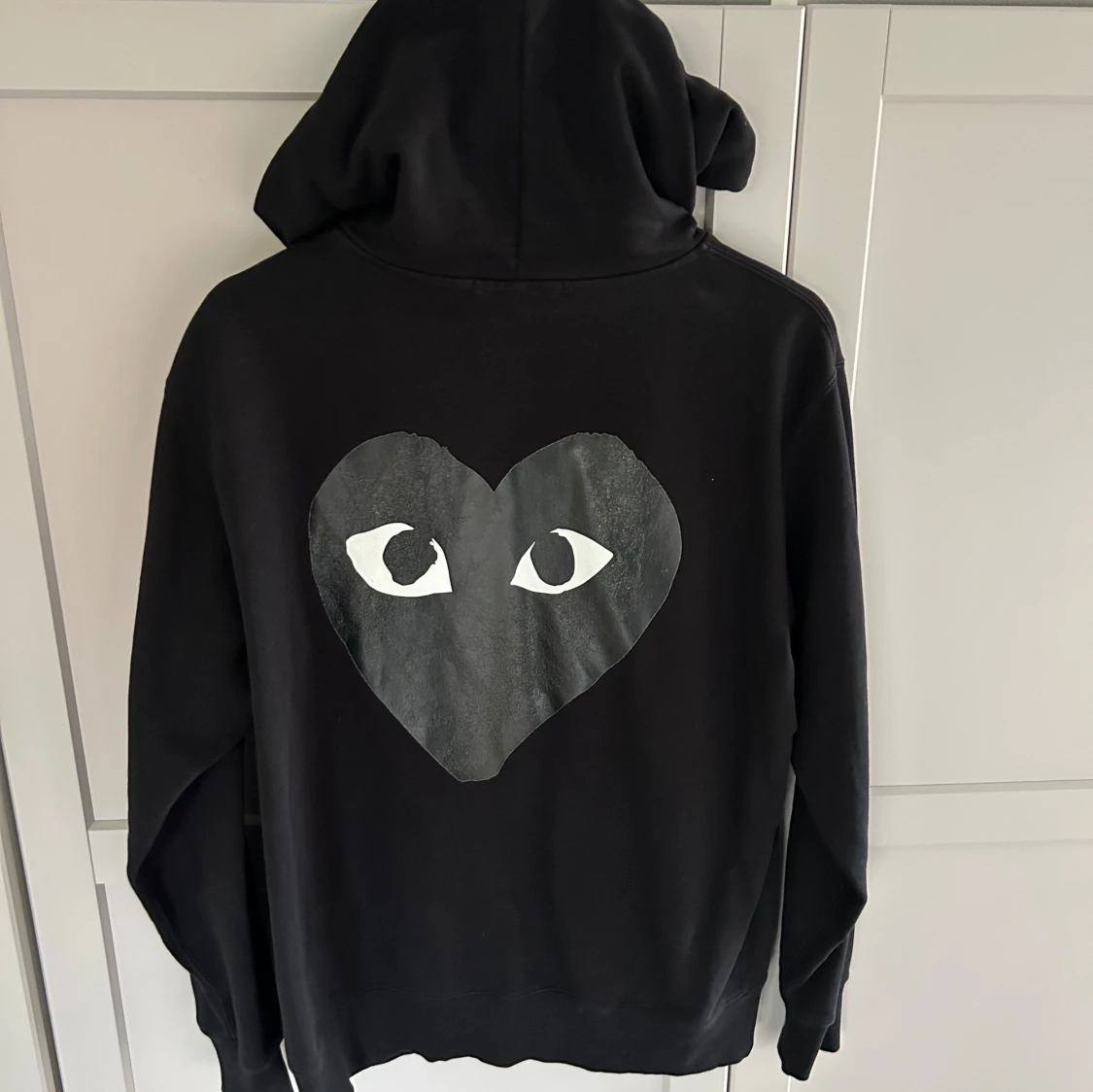 Svart hoodie med dragkedja från Comme des Garçons Play. Ikoniskt hjärta med ögon på bröstet och stort hjärta med ögon på ryggen. Mjuk bomullskvalitet och två fickor framtill. Perfekt för en stilren och cool look.