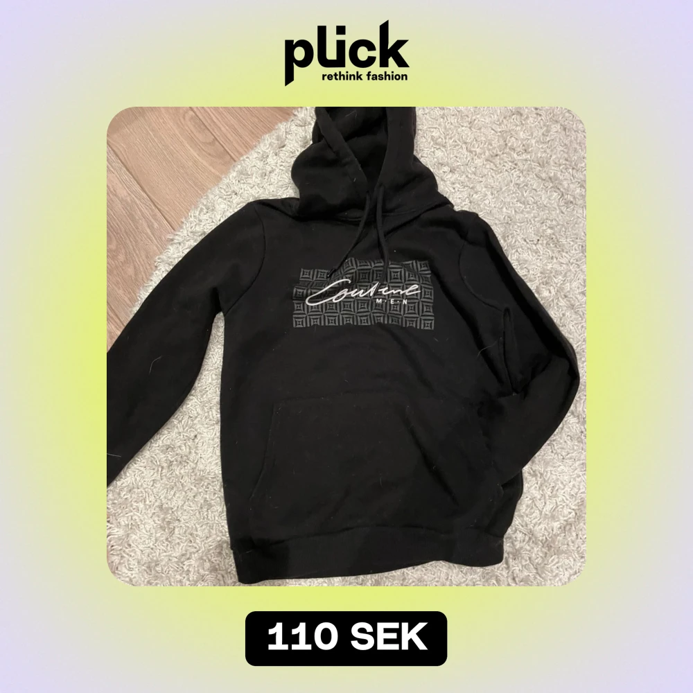 Säljer en snygg svart hoodie från Couture i mycket bra skick. Den har en cool design med ett tryck på bröstet och en stor ficka framtill. Perfekt för höst och vinter, och den är superbekväm att ha på sig.