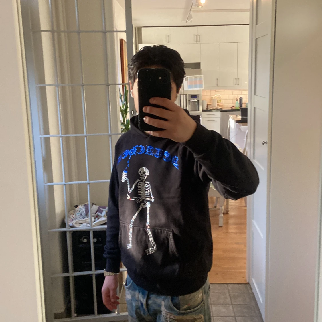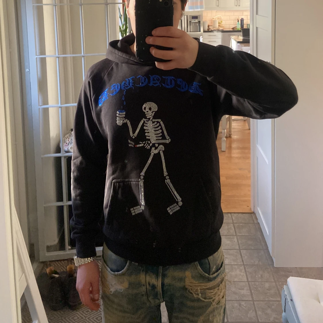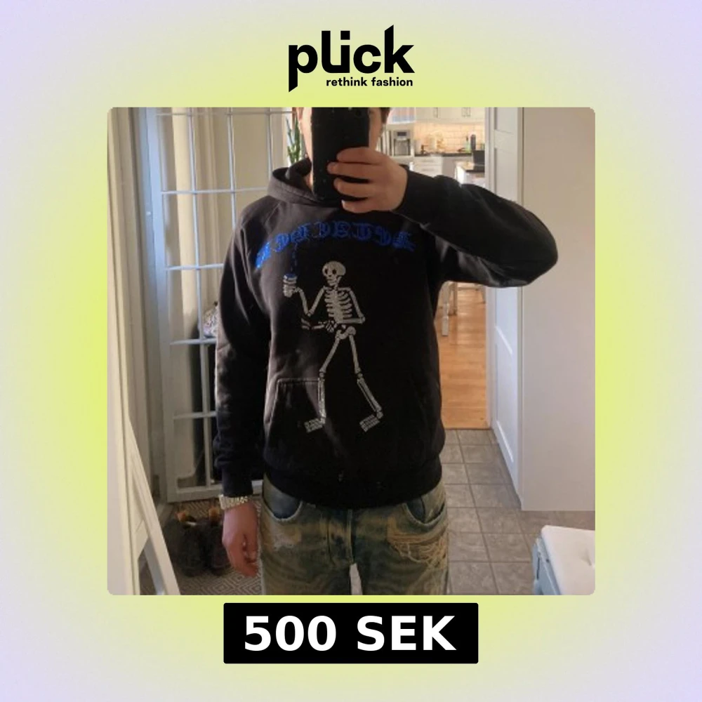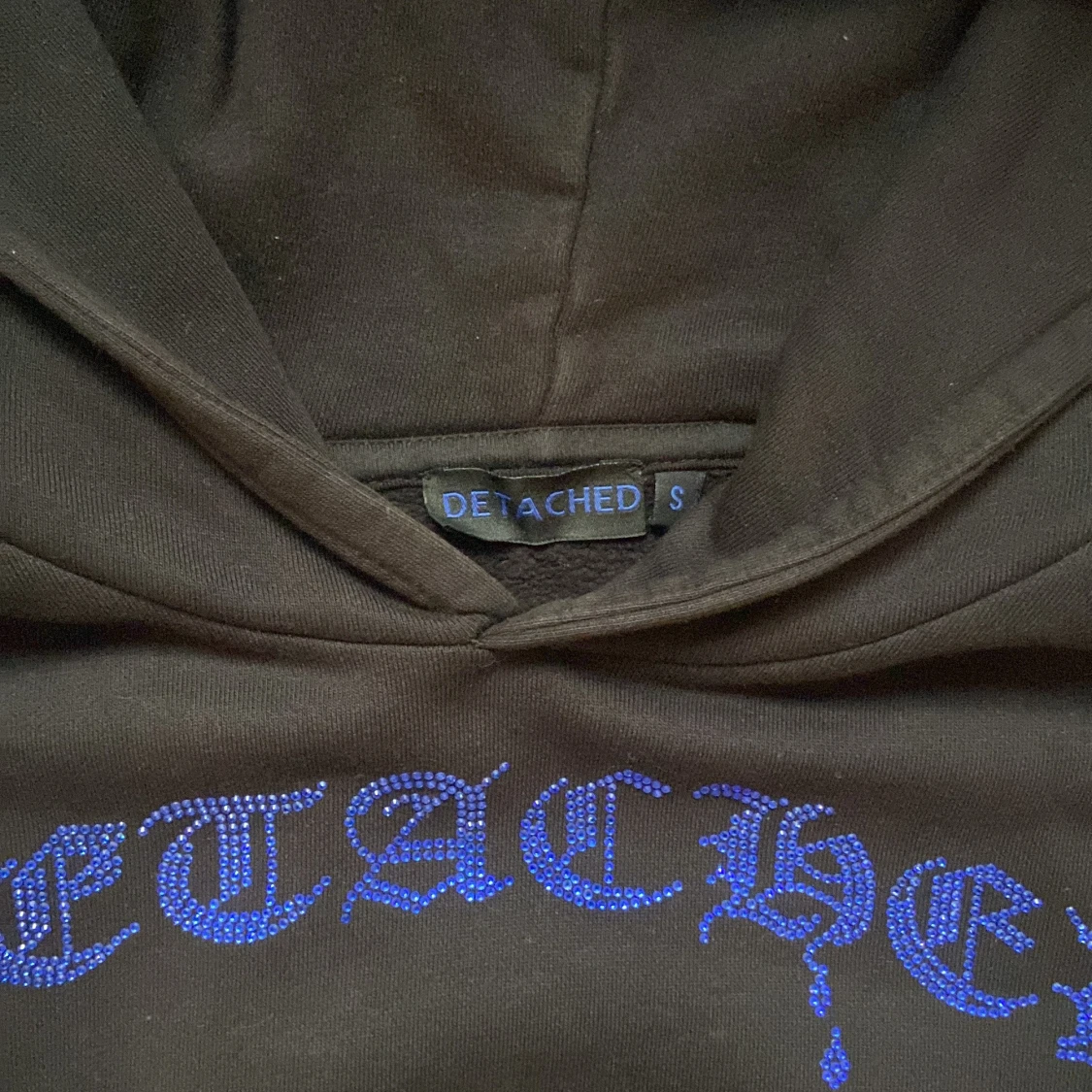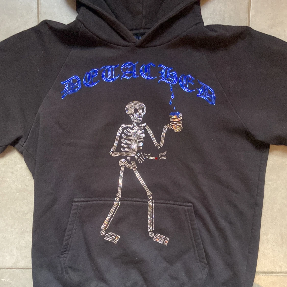 Storlek S och jag är 173 cm lång. Säljer en svart hoodie från Detached med ett coolt skelettmotiv och blå text på bröstet. Tröjan har en klassisk känguruficka och en bekväm huva. Perfekt för en avslappnad stil.