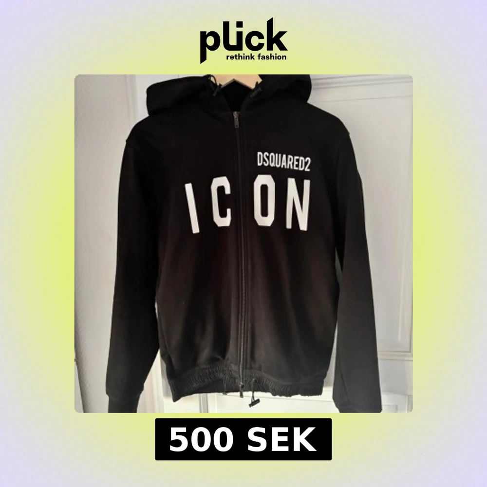 Säljer en svart hoodie från Dsquared2 med vit text 'ICON' och 'DSQUARED2' på bröstet. Tröjan har dragkedja framtill, huva och långa ärmar. Perfekt för en avslappnad och trendig stil.