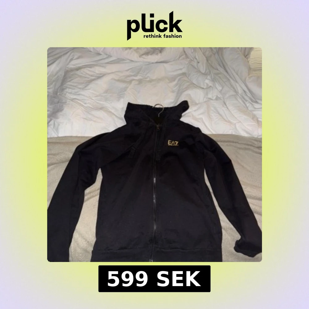 Svart hoodie från EA7 med guldfärgad logga på bröstet och dekorativa guldstreck på ryggen. Tröjan har huva med snörning, hel dragkedja framtill och långa ärmar. Perfekt för en chill och sportig stil.
