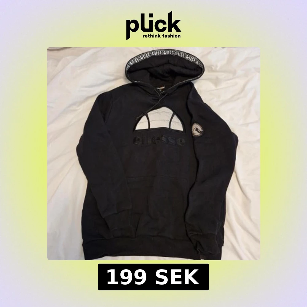 Säljer en svart hoodie från Ellesse med stor broderad logga på bröstet och patch på ärmen med texten 'Cortina D'Ampezzo'. Huva med dragsko och tryckt Ellesse-mönster på insidan. Perfekt för en sportig och avslappnad stil.