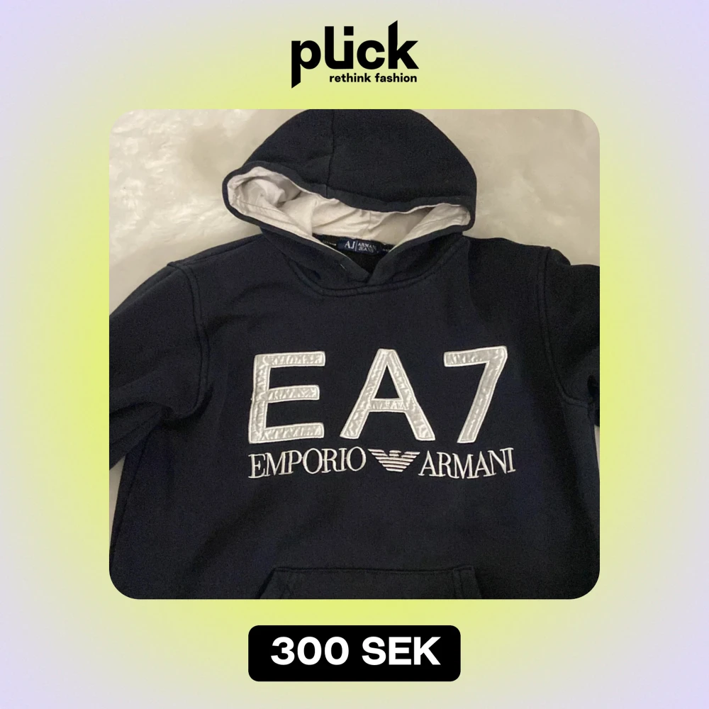 Säljer en snygg svart hoodie från Emporio Armani med stort EA7-tryck på framsidan. Den har en klassisk design med huva och är perfekt för både vardag och chill. Superbekväm och stilren, passar till allt! 🖤