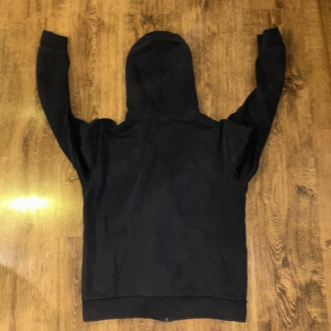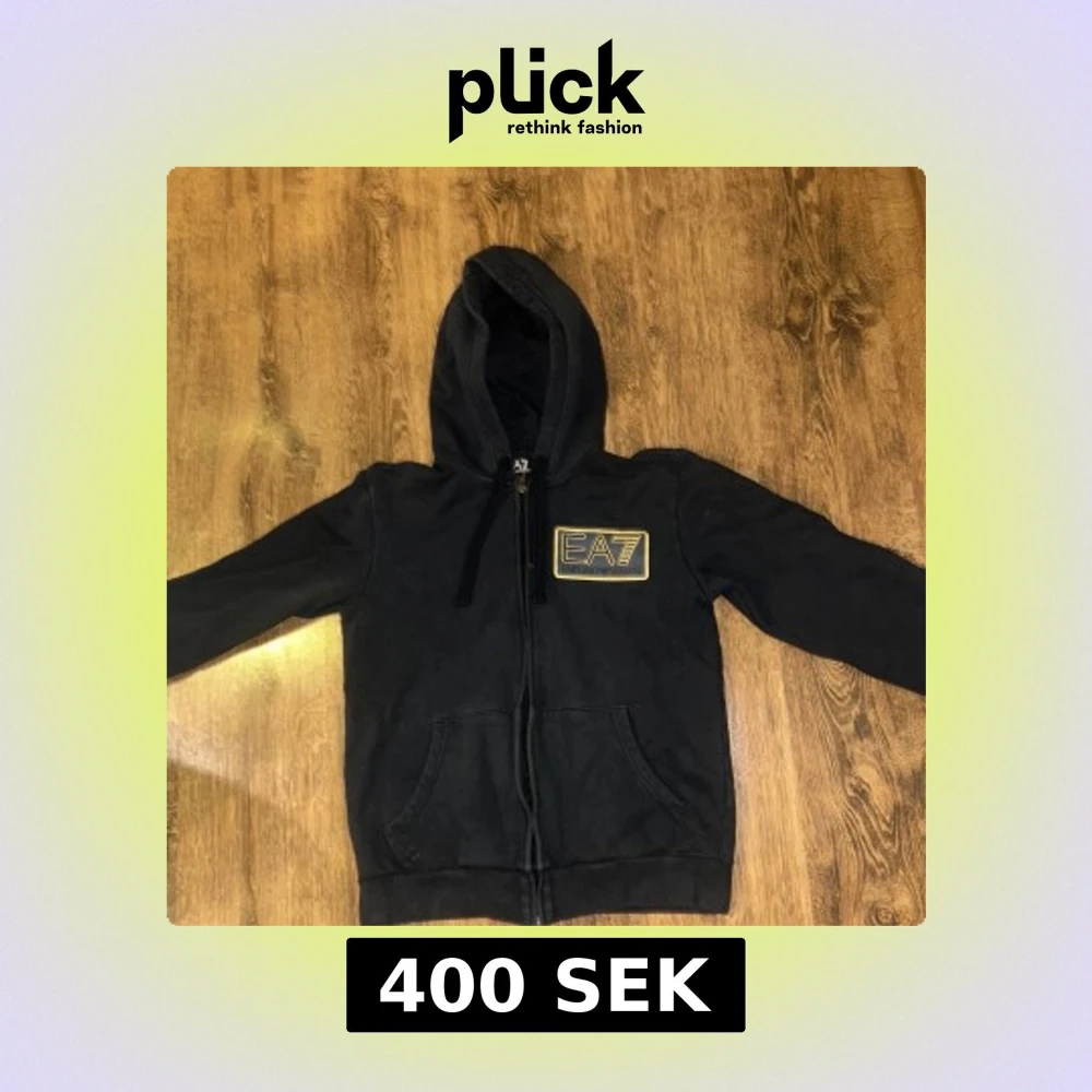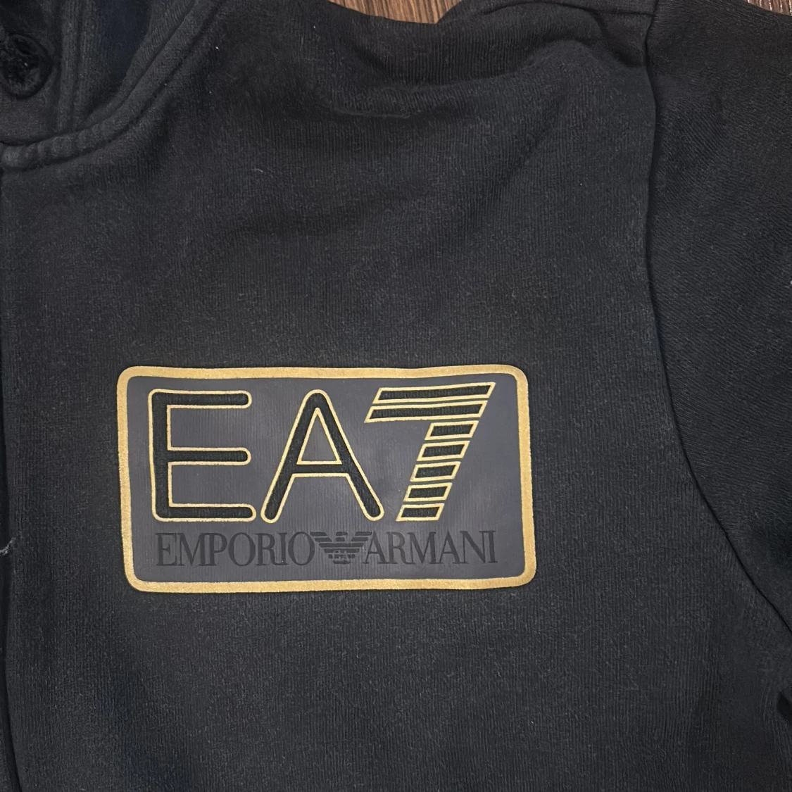 Säljer en stilren svart hoodie från Emporio Armani med guldtryck på bröstet. Den har dragkedja och en praktisk huva. Perfekt för en avslappnad look.
