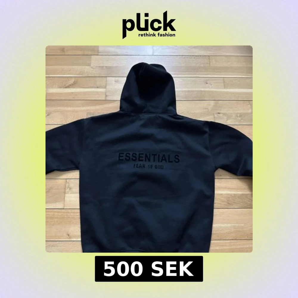 Säljer en svart hoodie från Fear of God Essentials med tryck på både bröstet och ryggen. Klassisk känguruficka framtill och huva. Perfekt för en stilren och avslappnad look. Passar även L