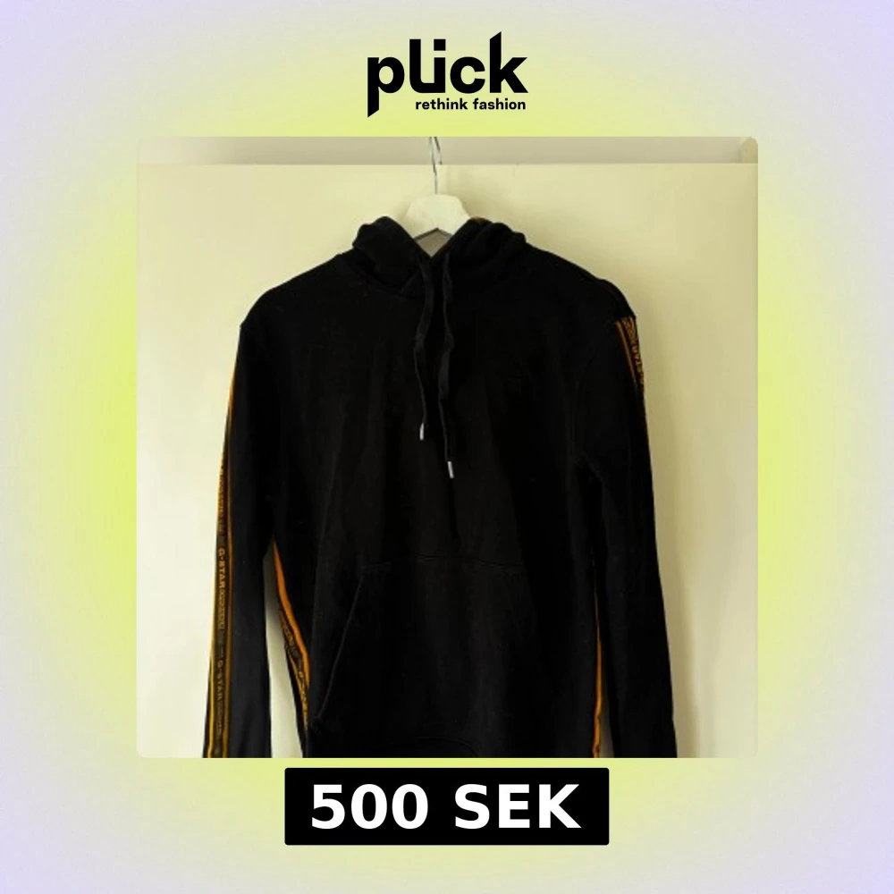 Svart hoodie från G-Star RAW med huva och dragsko. Gula ränder med text längs ärmarna ger en sportig look. Klassisk känguruficka framtill och ribbade muddar. Perfekt för en avslappnad stil.