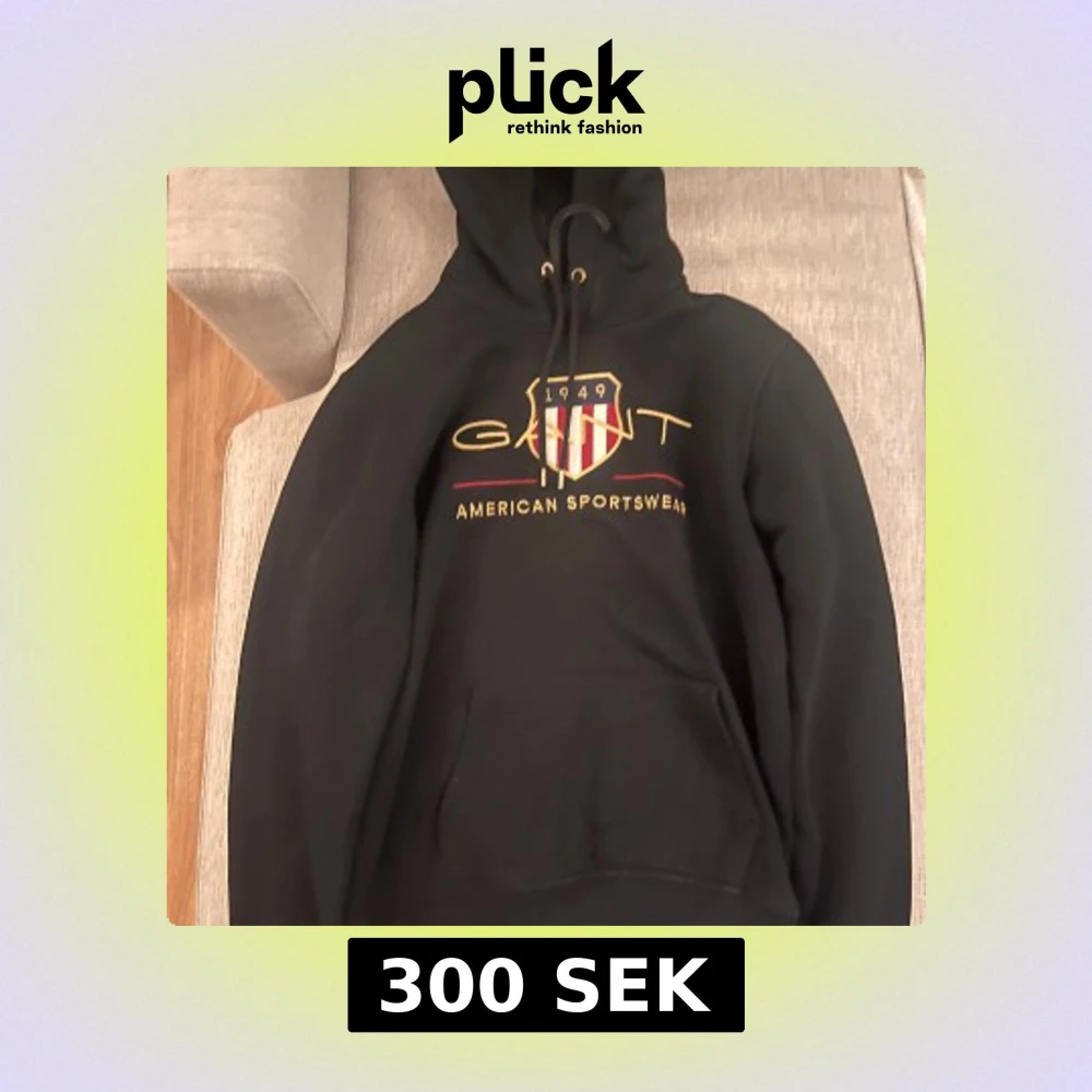 Säljer en svart hoodie från GANT med ett stort broderat emblem på bröstet. Hoodien har en justerbar huva med snören och en stor ficka framtill. Perfekt för en avslappnad stil.