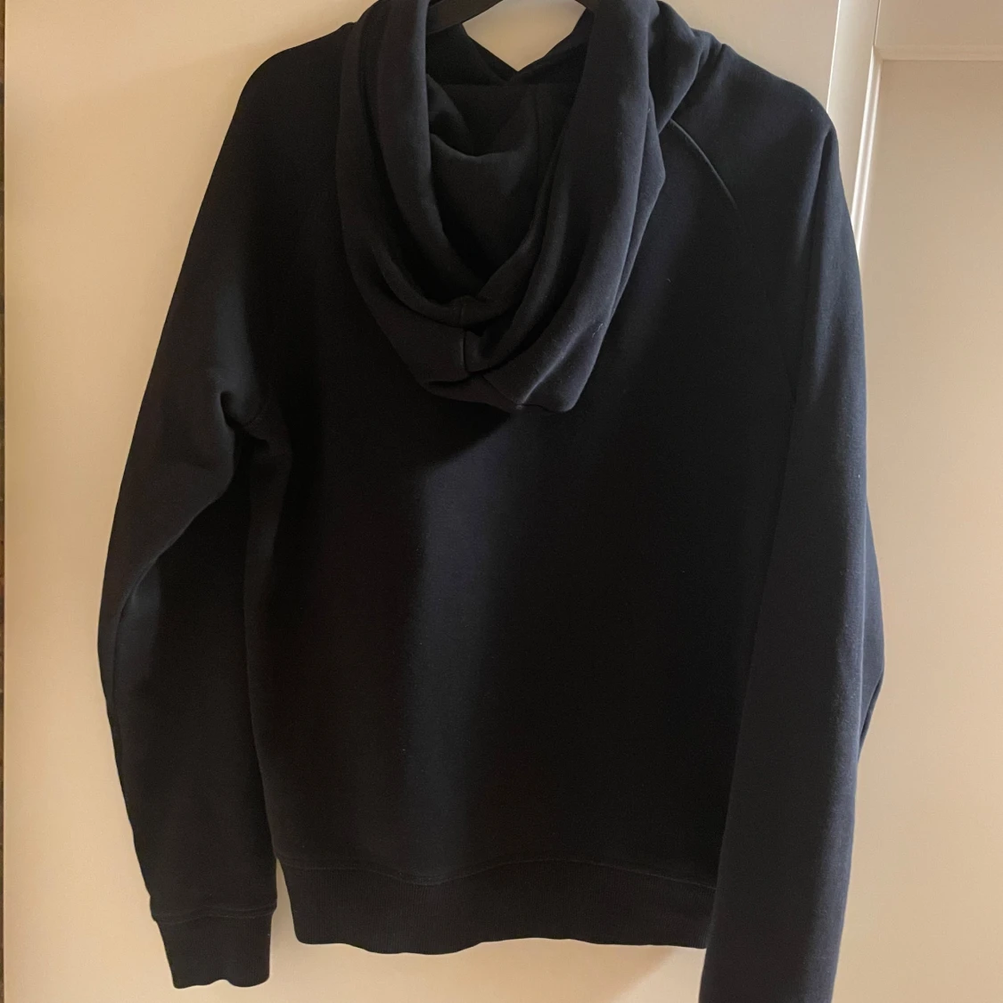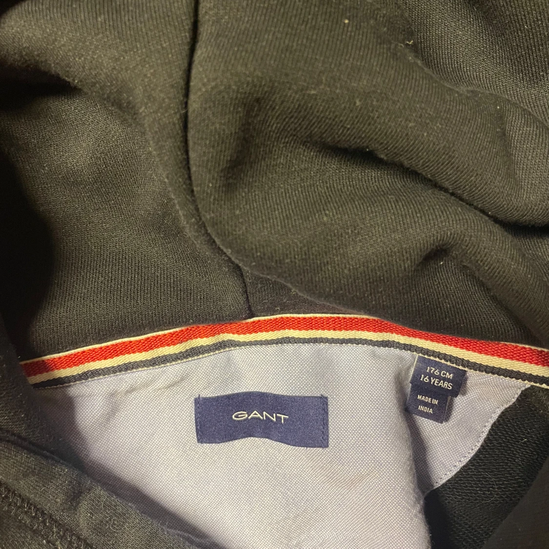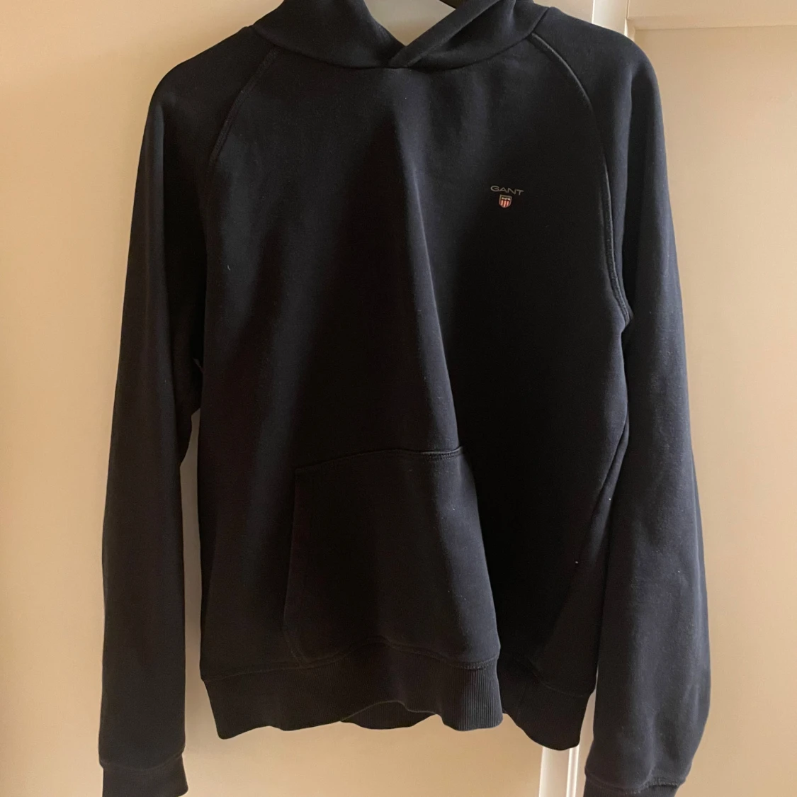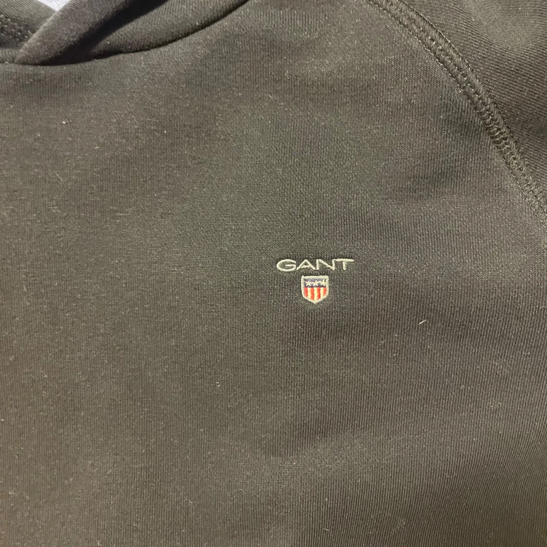 Säljer en stilren svart hoodie från GANT med deras klassiska logga på bröstet. Tröjan har en bekväm passform med långa ärmar och en praktisk huva. Perfekt för en avslappnad look. Storlek 176cm / Xs