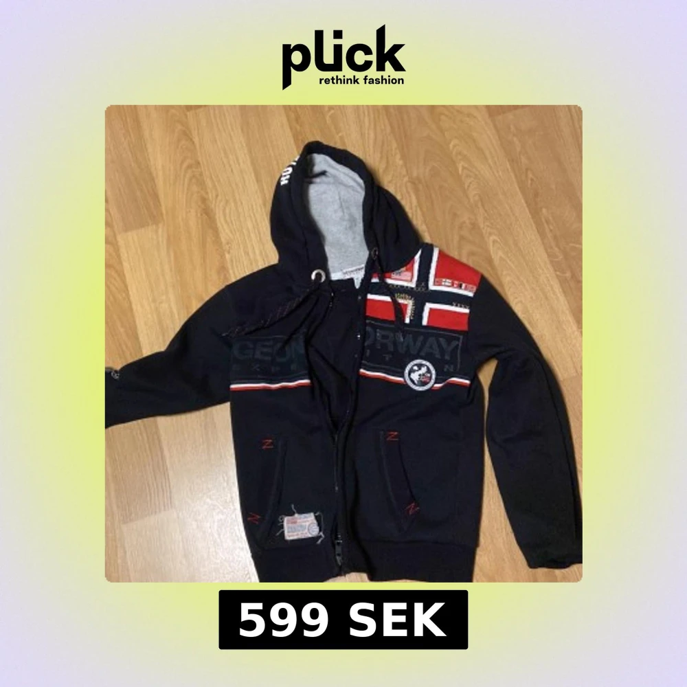 Säljer en svart hoodie från Geographical Norway med norsk flagga och tryckdetaljer. Tröjan har dragkedja och huva med snörning. Perfekt för kyliga dagar.