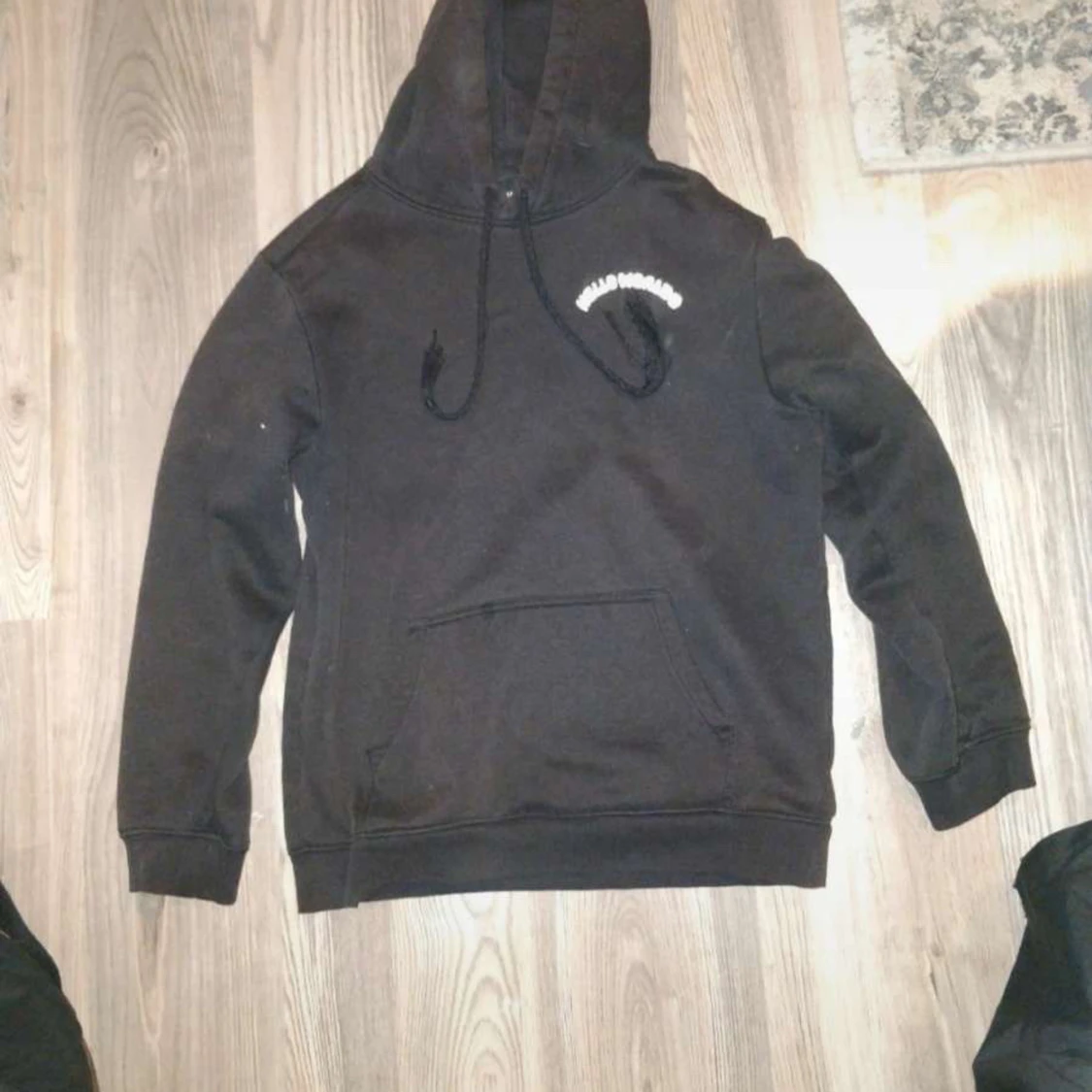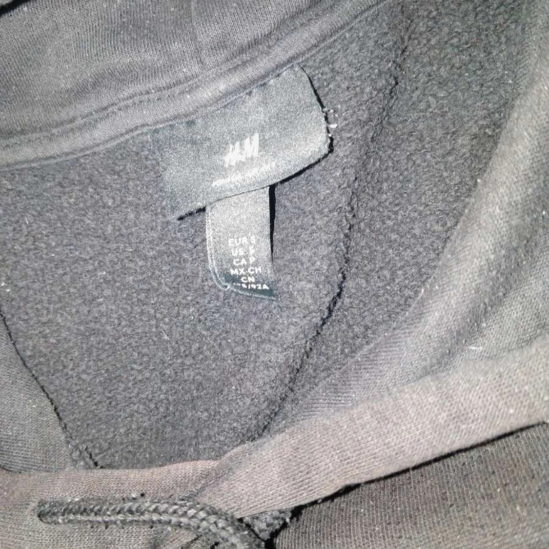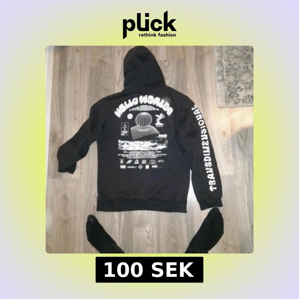 Säljer en svart hoodie från H&M med stort vitt tryck på ryggen och texten 'HELLO WORLD'. På ena ärmen står det 'TRANSDIMENSIONAL'. Hoodien har magficka och dragsko i huvan.