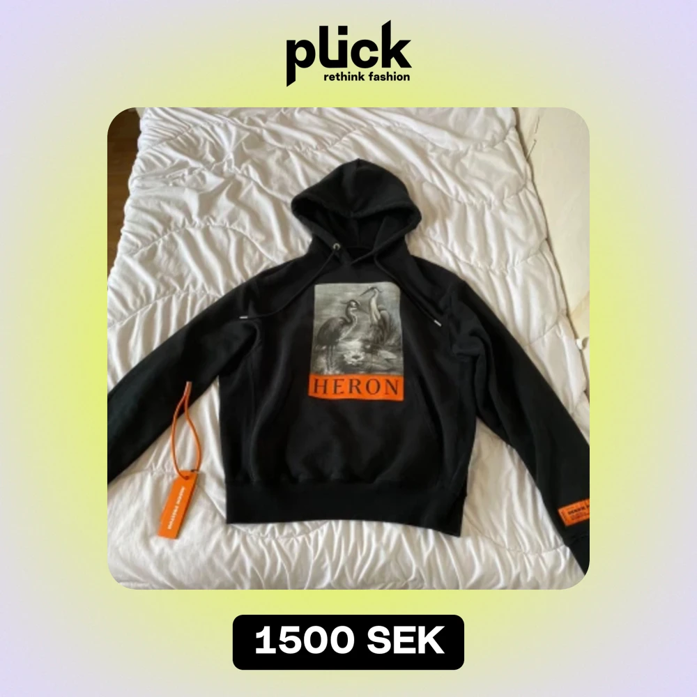 En svart hoodie från Heron Preston med en tryckt bild av två hägrar och texten 'HERON' i orange på framsidan. Hoodien har en justerbar huva och ribbade muddar vid ärmslut och nederkant. Märkesetikett i orange på ärmen.