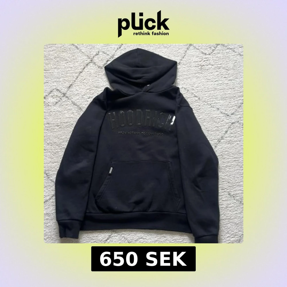 Svart hoodie från Hoodrich med stor logga i relief på bröstet. Klassisk känguruficka framtill och huva. Perfekt för en avslappnad streetwear-look. Mjuk insida och ribbade muddar vid ärmslut och nederkant.