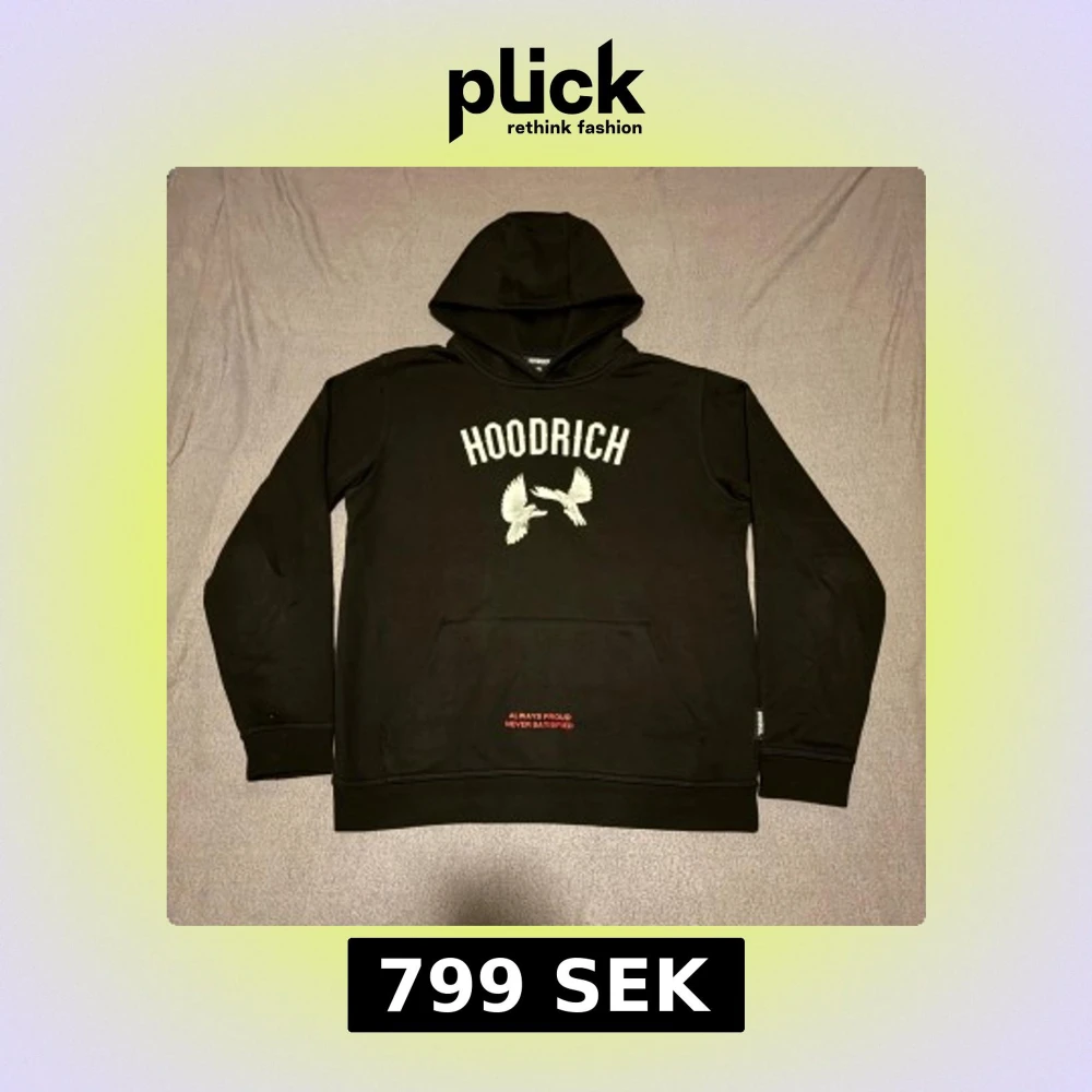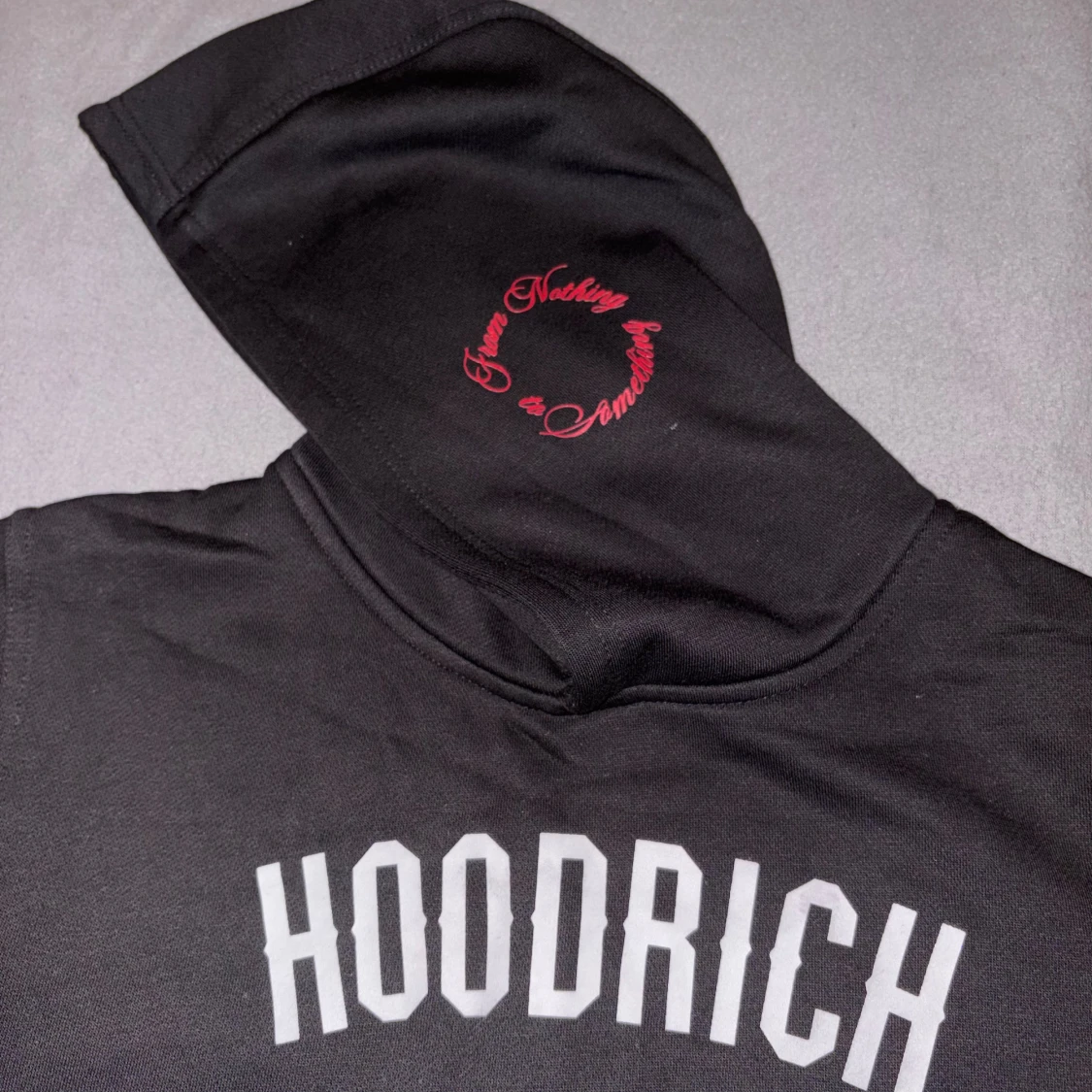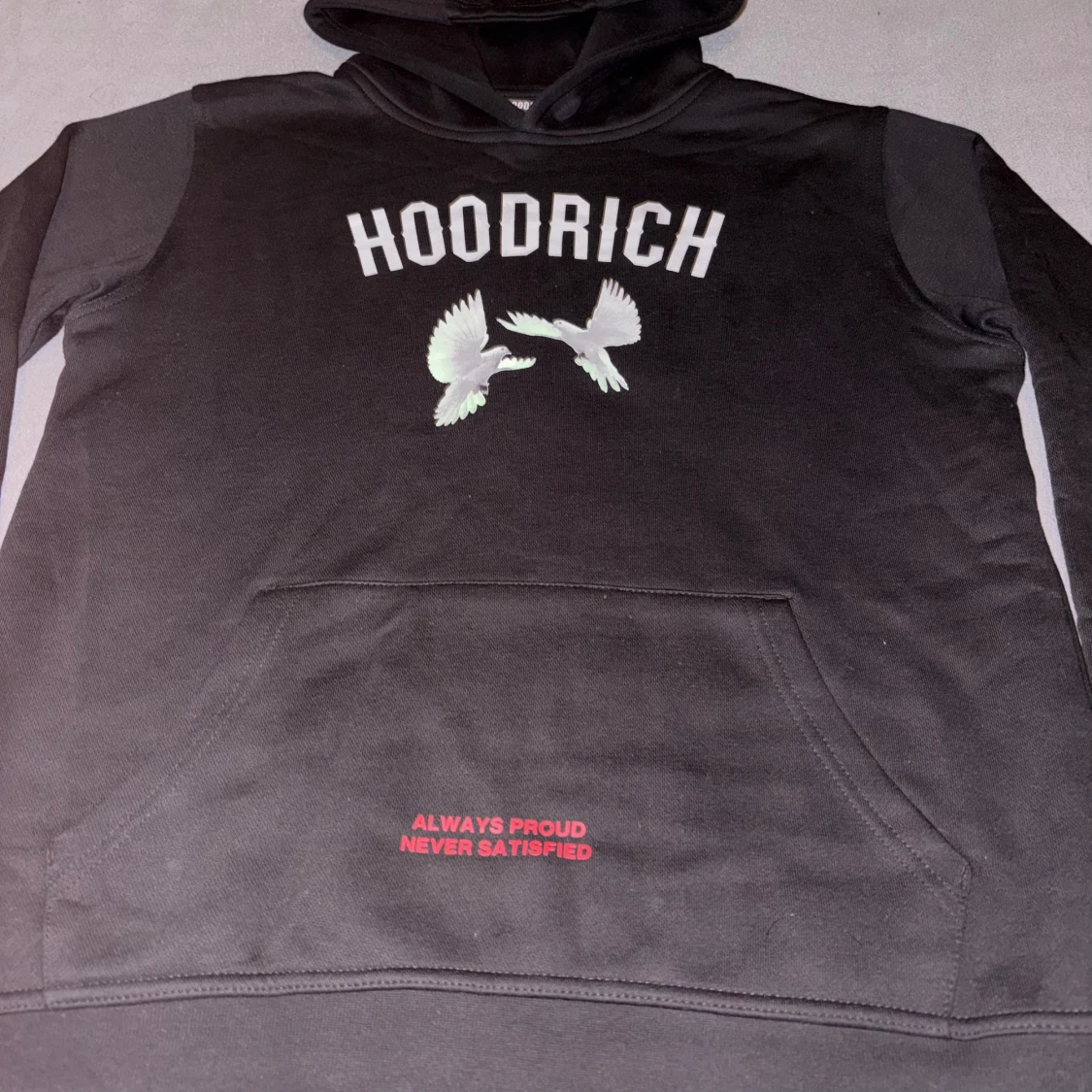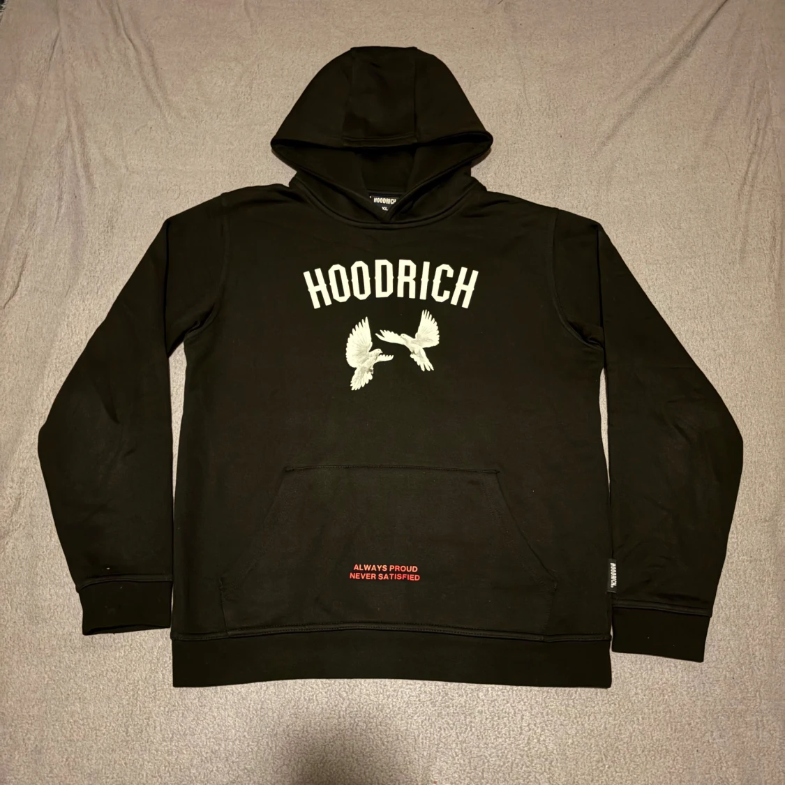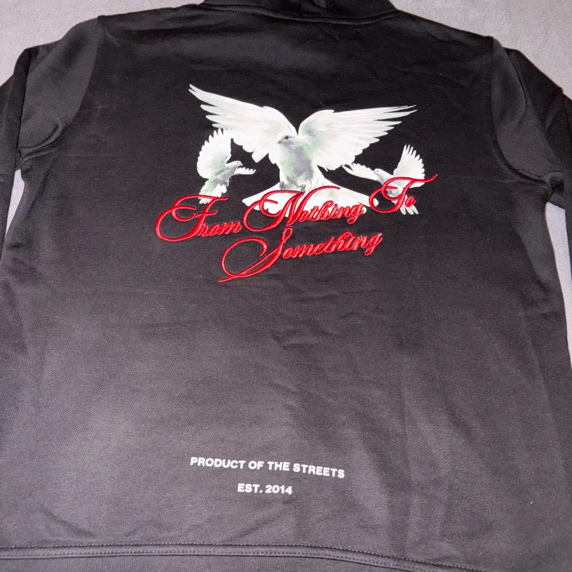 Svart hoodie från Hoodrich med stor vit logga framtill och tryckta vita duvor. Baksidan har coolt motiv med duvor och röd text 'From Nothing To Something'. Huva med röd broderad text, känguruficka och mjukt material. Perfekt streetwear för dig som vill sticka ut.