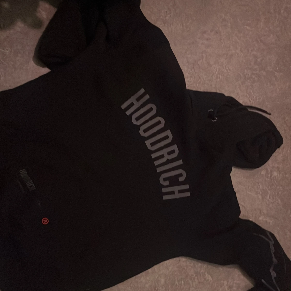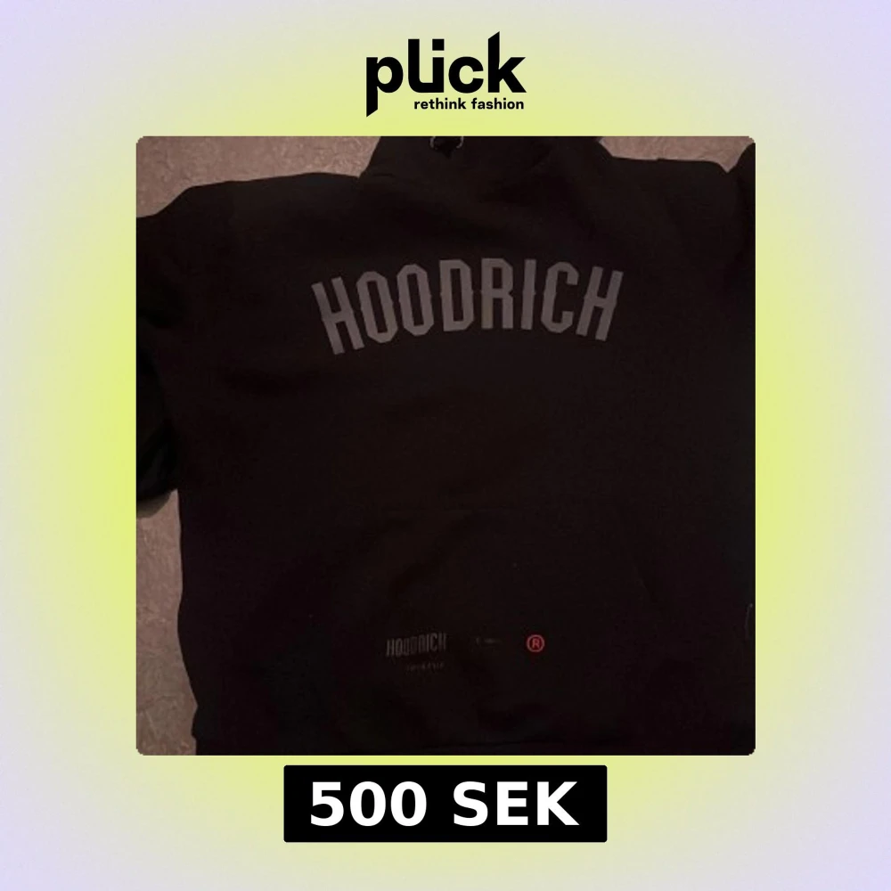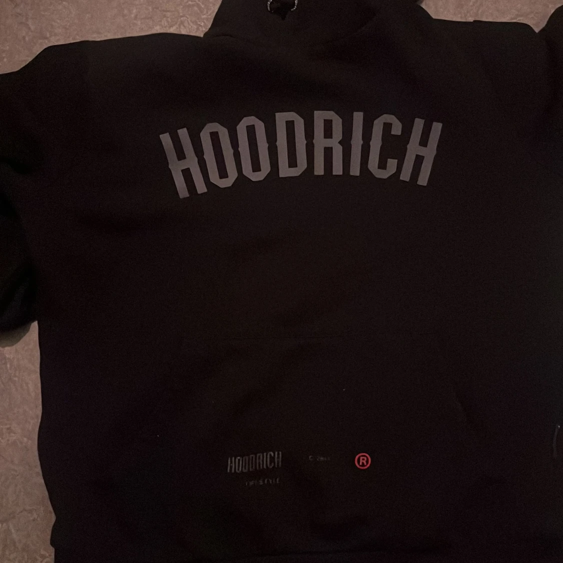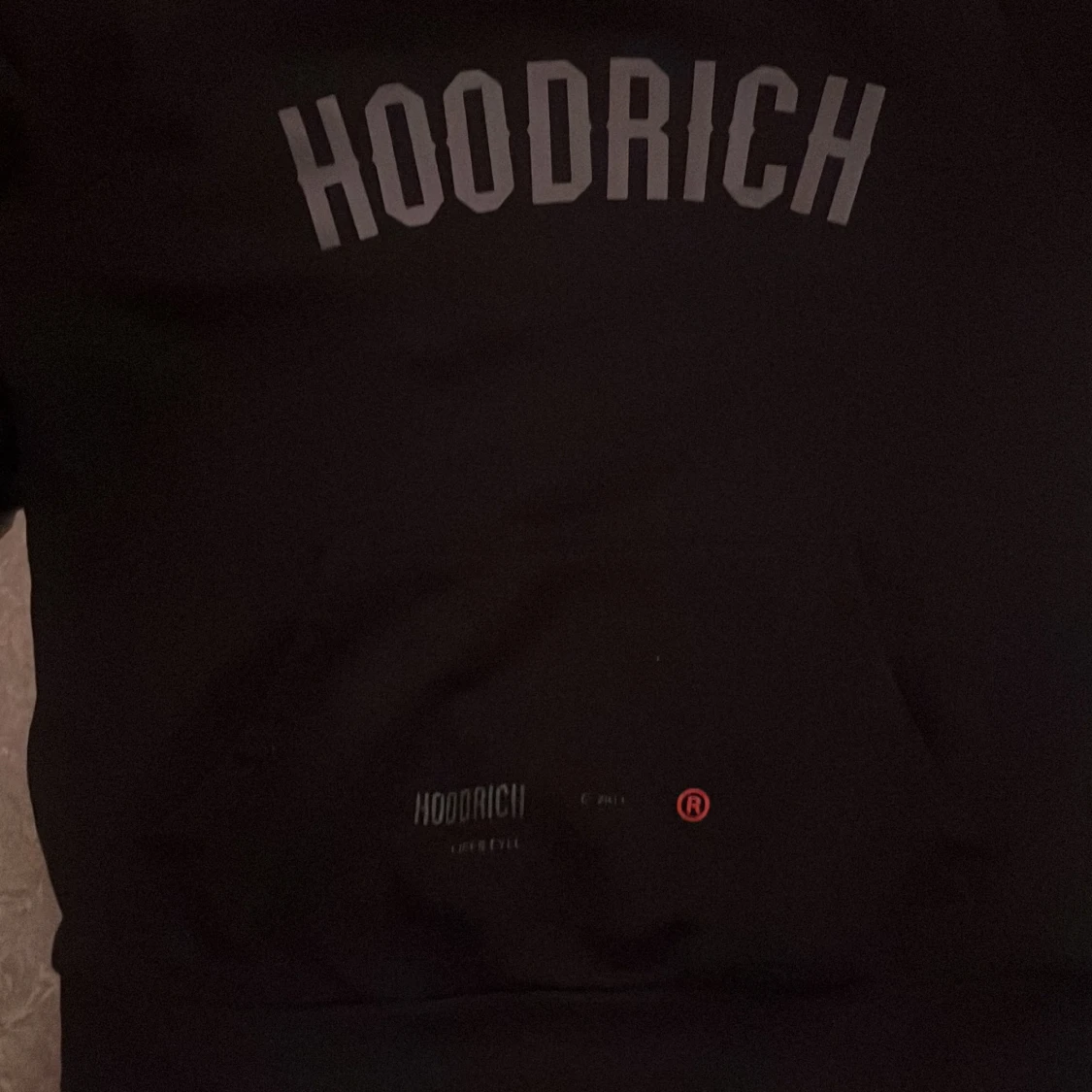 Svart hoodie från Hoodrich med stor logga i grått över bröstet och mindre tryck på fickan. Klassisk huva med snörning och känguruficka framtill. Perfekt för en streetwear-look och chill dagar.