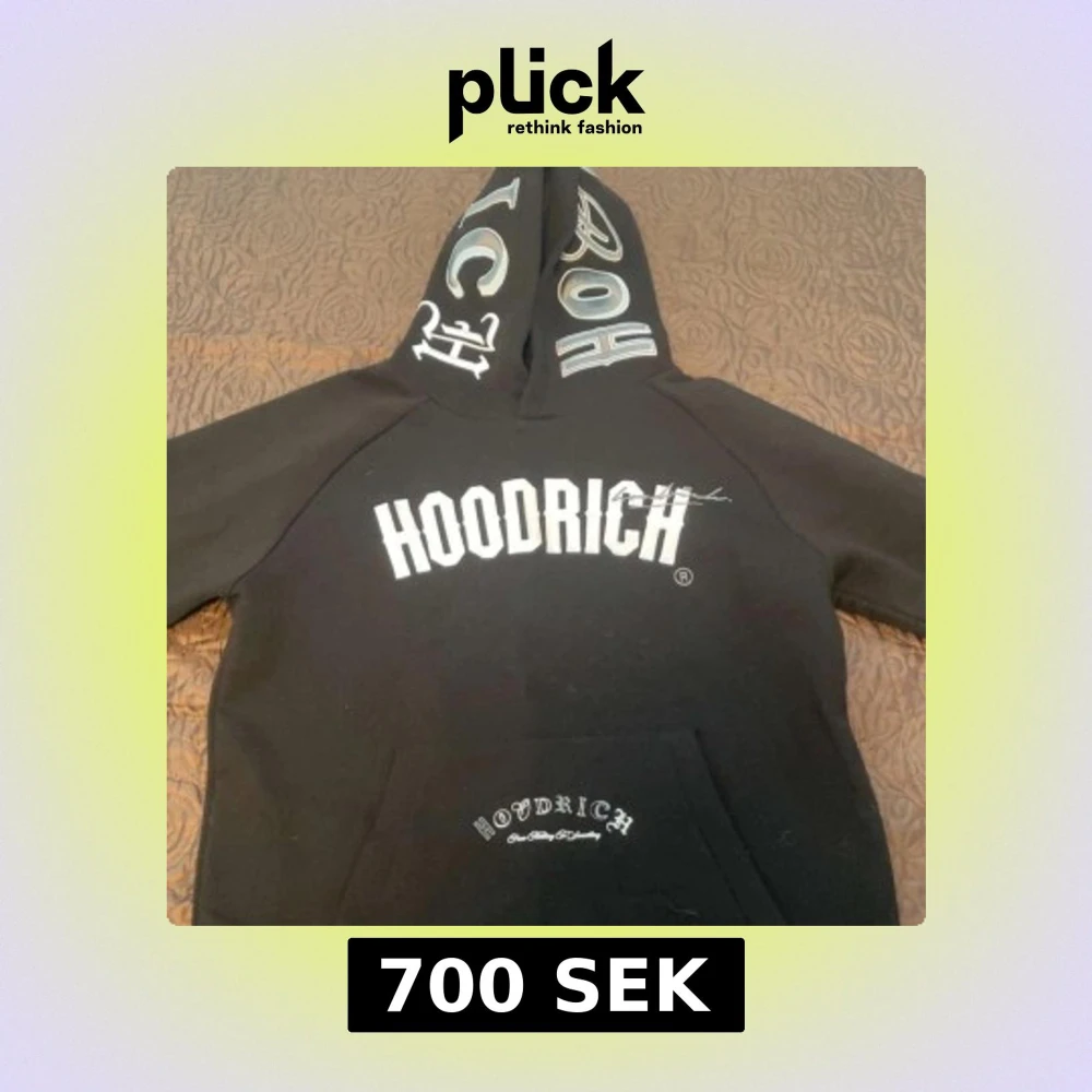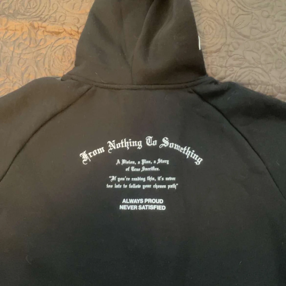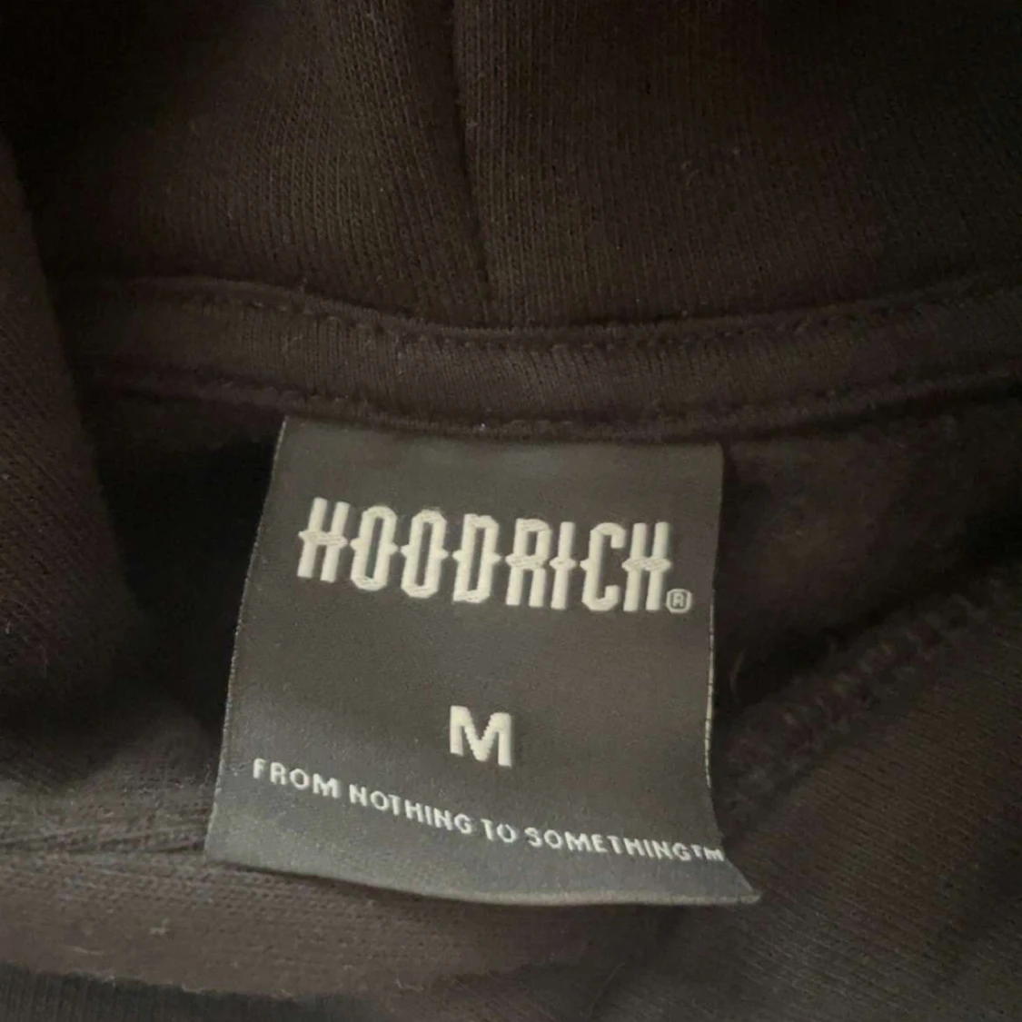 Svart hoodie från Hoodrich i storlek M med stora vita tryck både fram och bak samt på huvan. Klassisk känguruficka framtill och coola detaljer med texten 'From Nothing To Something'. Perfekt för dig som gillar streetwear och vill sticka ut.