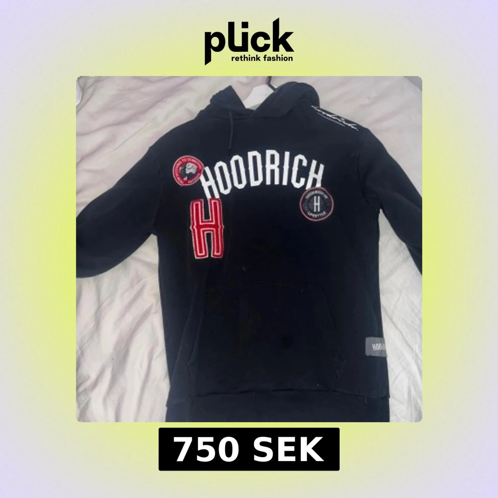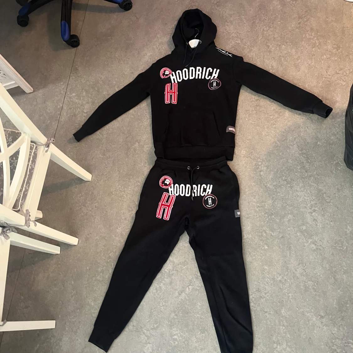 Svart hoodie från Hoodrich med stora vita och röda tryck på bröstet, samt broderade patches. Tröjan har huva med snörning och en klassisk känguruficka framtill. Långärmad och med ribbade muddar. Perfekt för streetwear-stilen.