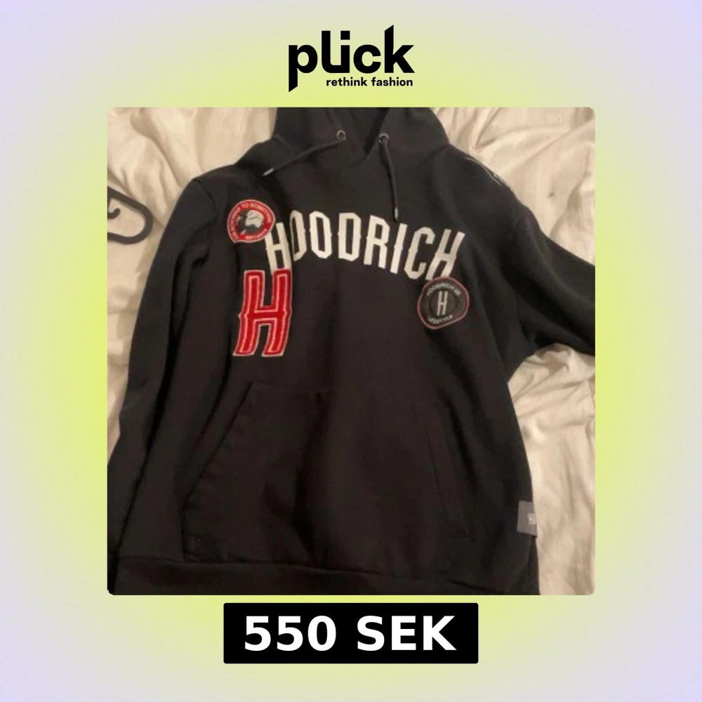Säljer en svart hoodie från Hoodrich med vita bokstäver och röda detaljer. Hoodien har en stor ficka framtill och justerbar huva med snören. Perfekt för en avslappnad stil.