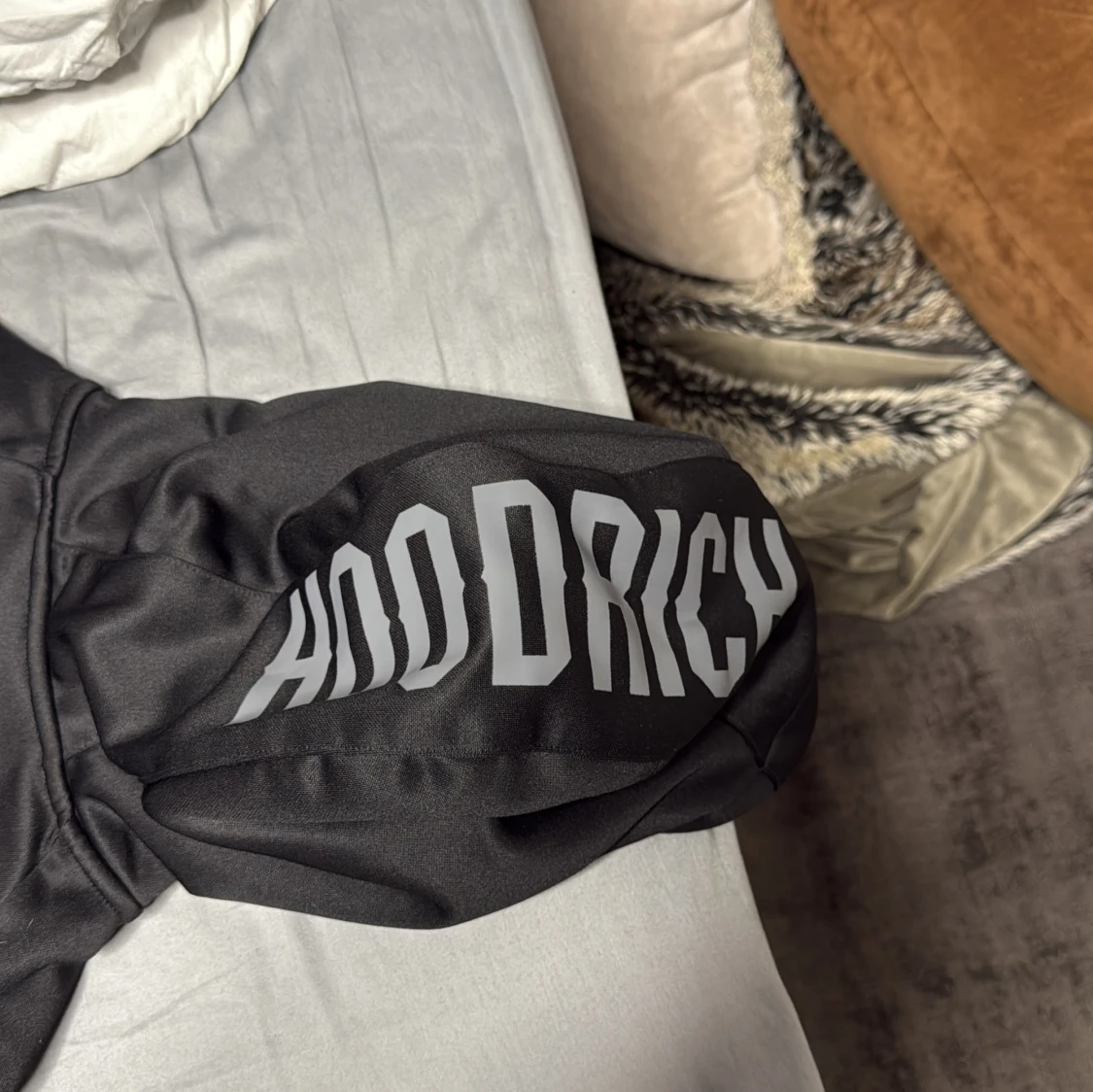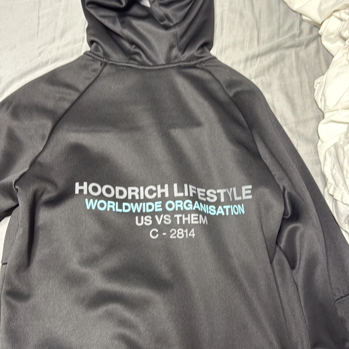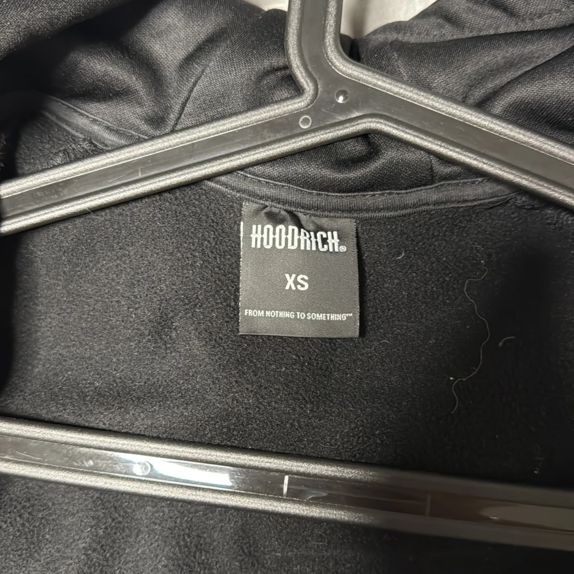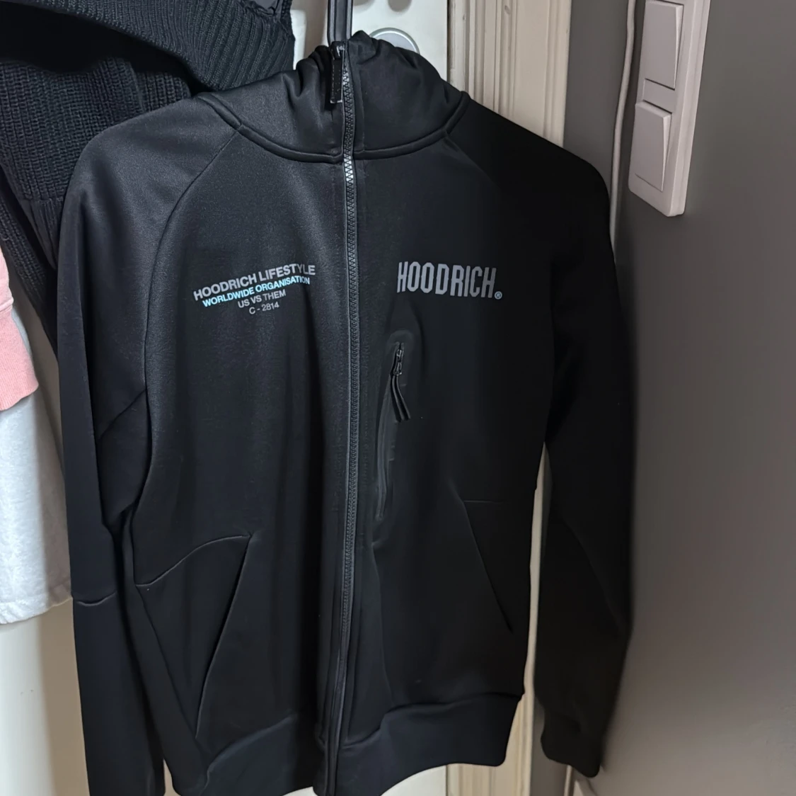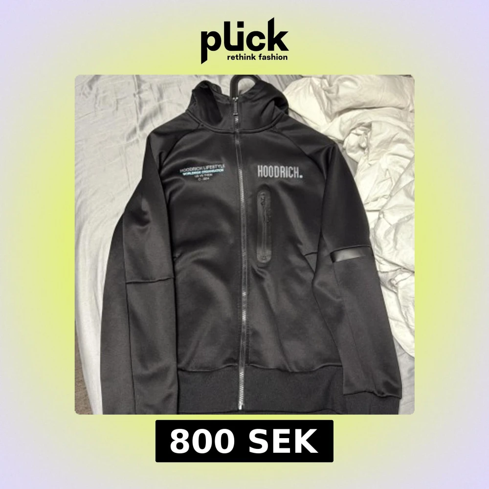 Svart hoodie från Hoodrich med tryck på bröstet, ryggen och ena ärmen. Tröjan har hel dragkedja, huva och en bröstficka med dragkedja. Materialet är mjukt och slätt, perfekt för streetwear-vibe.